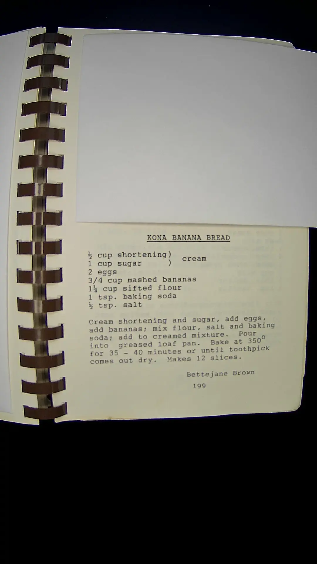 Here's the text from the image: **KONA BANANA BREAD** 1/2 cup shortening 1 cup sugar 2 eggs 3/4 cup mashed bananas 1 1/4 cup sifted flour 1 tsp. baking soda 1/2 tsp. salt Cream shortening and sugar, add eggs, add bananas; mix flour, salt, and baking soda; add to creamed mixture. Pour into greased loaf pan. Bake at 350°F for 35 - 40 minutes or until toothpick comes out dry. Makes 12 slices. Bettejane Brown 199llm