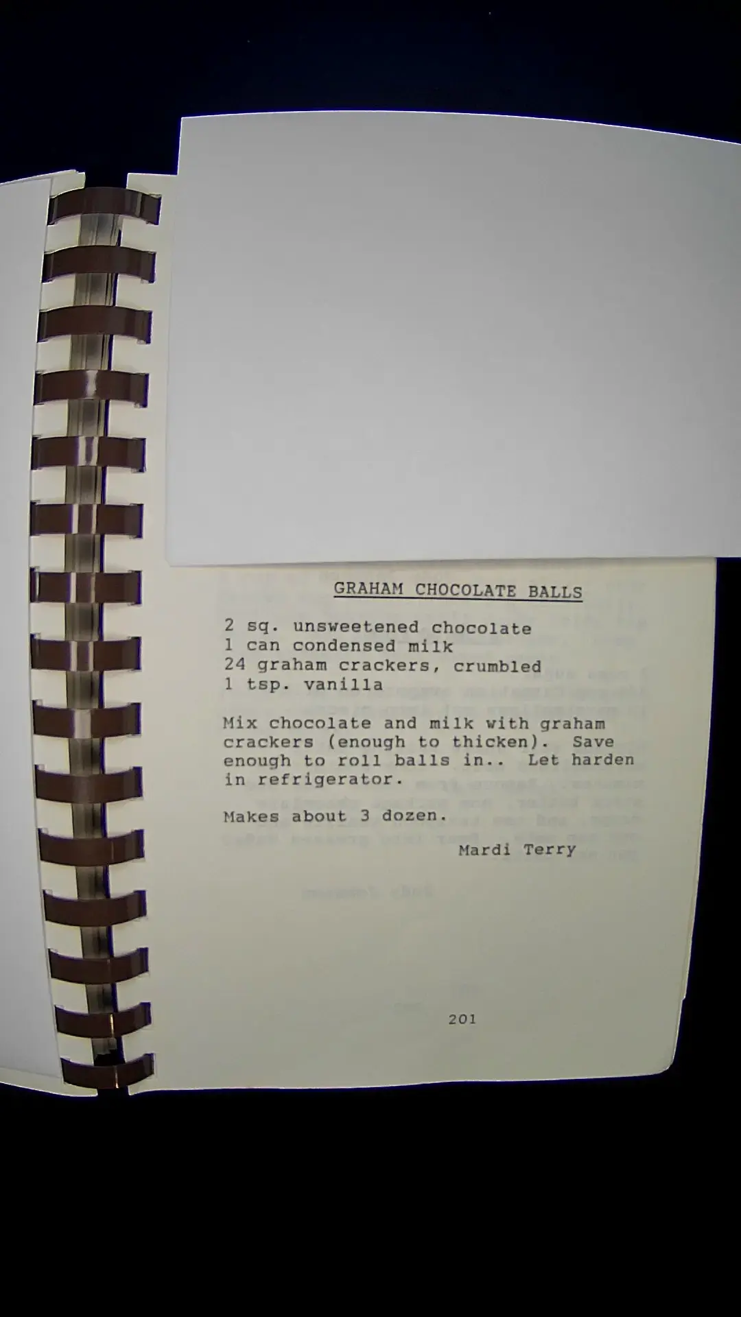 Here's the text from the image: **GRAHAM CHOCOLATE BALLS** - 2 sq. unsweetened chocolate - 1 can condensed milk - 24 graham crackers, crumbled - 1 tsp. vanilla **Instructions:** Mix chocolate and milk with graham crackers (enough to thicken). Save enough to roll balls in. Let harden in refrigerator. Makes about 3 dozen. *Mardi Terry* *201*llm