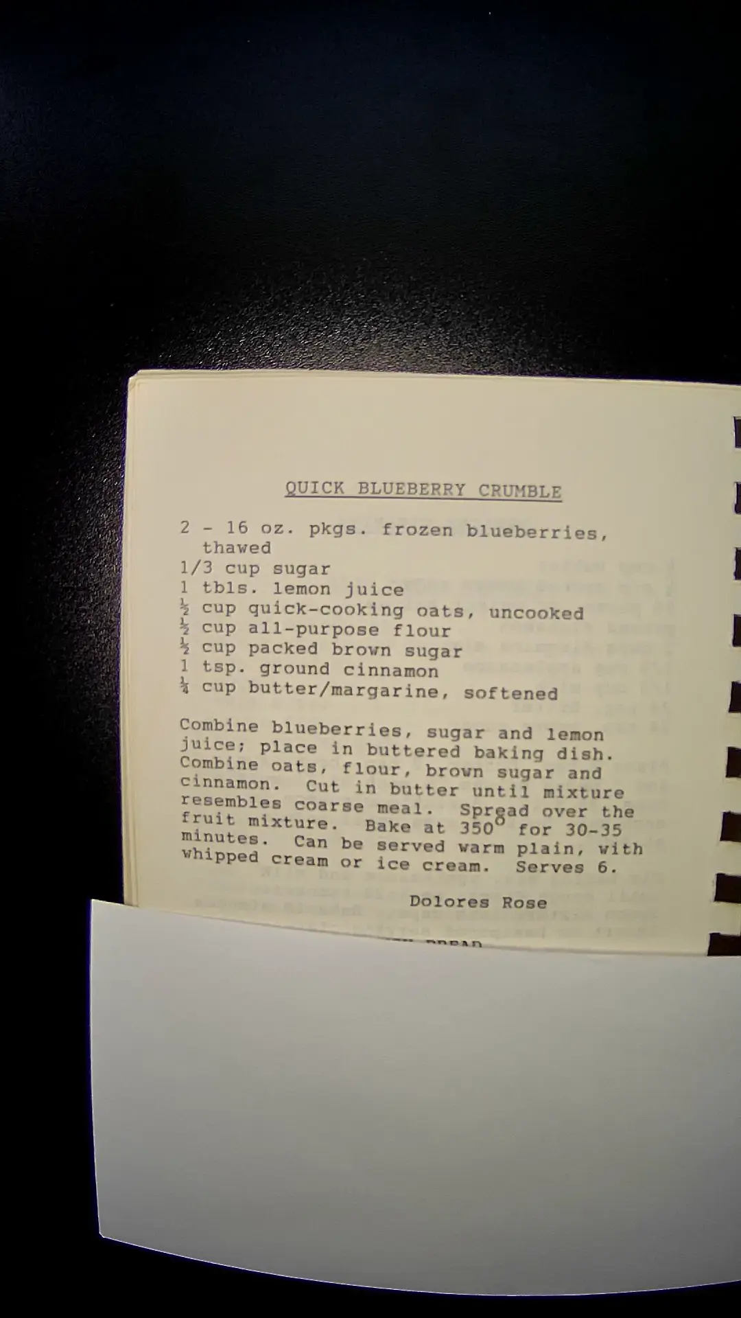 Hereβs the text from the image: **QUICK BLUEBERRY CRUMBLE** Ingredients: - 2 - 16 oz. pkgs. frozen blueberries, thawed - 1/3 cup sugar - 1 tbls. lemon juice - Β½ cup quick-cooking oats, uncooked - Β½ cup all-purpose flour - Β½ cup packed brown sugar - 1 tsp. ground cinnamon - ΒΎ cup butter/margarine, softened Instructions: 1. Combine blueberries, sugar, and lemon juice; place in buttered baking dish. 2. Combine oats, flour, brown sugar, and cinnamon. Cut in butter until mixture resembles coarse meal. Spread over the fruit mixture. 3. Bake at 350Β°F for 30-35 minutes. Can be served warm plain, with whipped cream or ice cream. Serves 6. **Dolores Rose**llm