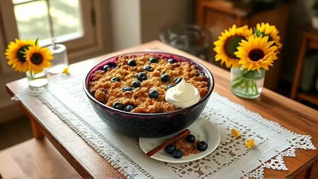 This quick and easy blueberry crumble is a delightful dessert that can be whipped up in no time! With its sweet and tart flavors balanced perfectly by a crispy topping, it's an indulgence you won't want to miss. Perfect for family gatherings, picnics, or simply to satisfy your sweet tooth, this dish is versatile enough to be enjoyed warm or cold.