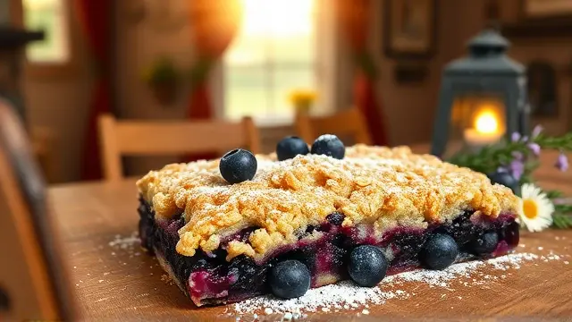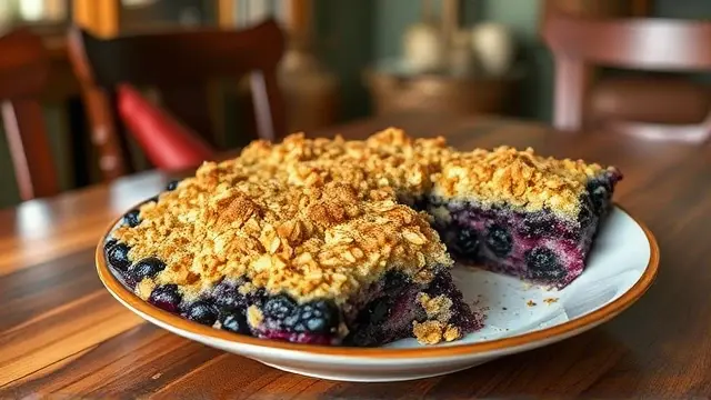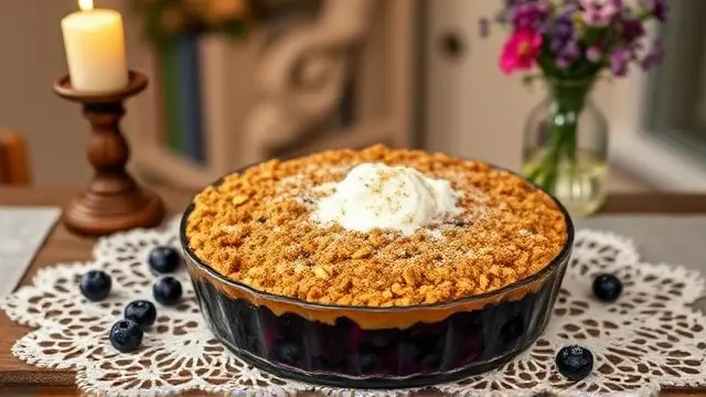 # Dolores's Delicious Blueberry Crumble ππ This quick and easy blueberry crumble is a delightful dessert that can be whipped up in no time! With its sweet and tart flavors balanced perfectly by a crispy topping, it's an indulgence you won't want to miss. Perfect for family gatherings, picnics, or simply to satisfy your sweet tooth, this dish is versatile enough to be enjoyed warm or cold. Serve it warm straight from the oven with a scoop of vanilla ice cream or a generous dollop of whipped cream for an extra treat! π¦π° ## Ingredients ### For the filling - 2 (16 oz) packages frozen blueberries, thawed - 1/3 cup sugar - 1 tablespoon lemon juice ### For the crumble topping - 1/2 cup quick-cooking oats, uncooked - 1/2 cup all-purpose flour - 1/2 cup packed brown sugar - 1 teaspoon ground cinnamon - 3/4 cup butter or margarine, softened ## Instructions 1. In a large bowl, combine the thawed blueberries with sugar and lemon juice. Pour the mixture into a buttered baking dish. > π A touch of lemon juice brightens up the flavors of the blueberries. You can also use lime juice for a fun twist! 2. In another bowl, mix together oats, flour, brown sugar, and cinnamon. Cut in the softened butter until the mixture resembles coarse meal. > π§ For a richer topping, consider using salted butter for a touch of savory flavor. 3. Evenly spread the crumble topping over the blueberry mixture. 4. Bake in a preheated oven at 350Β°F (175Β°C) for 30-35 minutes, until the topping is golden brown and the blueberries are bubbly. 5. Serve warm, with or without ice cream or whipped cream. ## Tips & Variations - **Fresh Blueberries**: If you have fresh blueberries available, feel free to substitute them; just add about 1/4 cup more sugar. - **Nutty Addition**: Adding chopped nuts like walnuts or pecans to the crumble topping will give it extra crunch and flavor! - **Spices**: Experiment with other spices such as nutmeg or ginger to add warmth and complexity to the topping. - **Serve It Up**: This crumble can be served at breakfast as well! Add a dollop of yogurt on top for a healthy start to your day. π₯£ ## Storage - Leftovers can be stored in an airtight container in the fridge for up to 3 days. Reheat in the oven or microwave before serving! Enjoy this scrumptiously easy dessert and keep Dolores's tradition alive! ππname