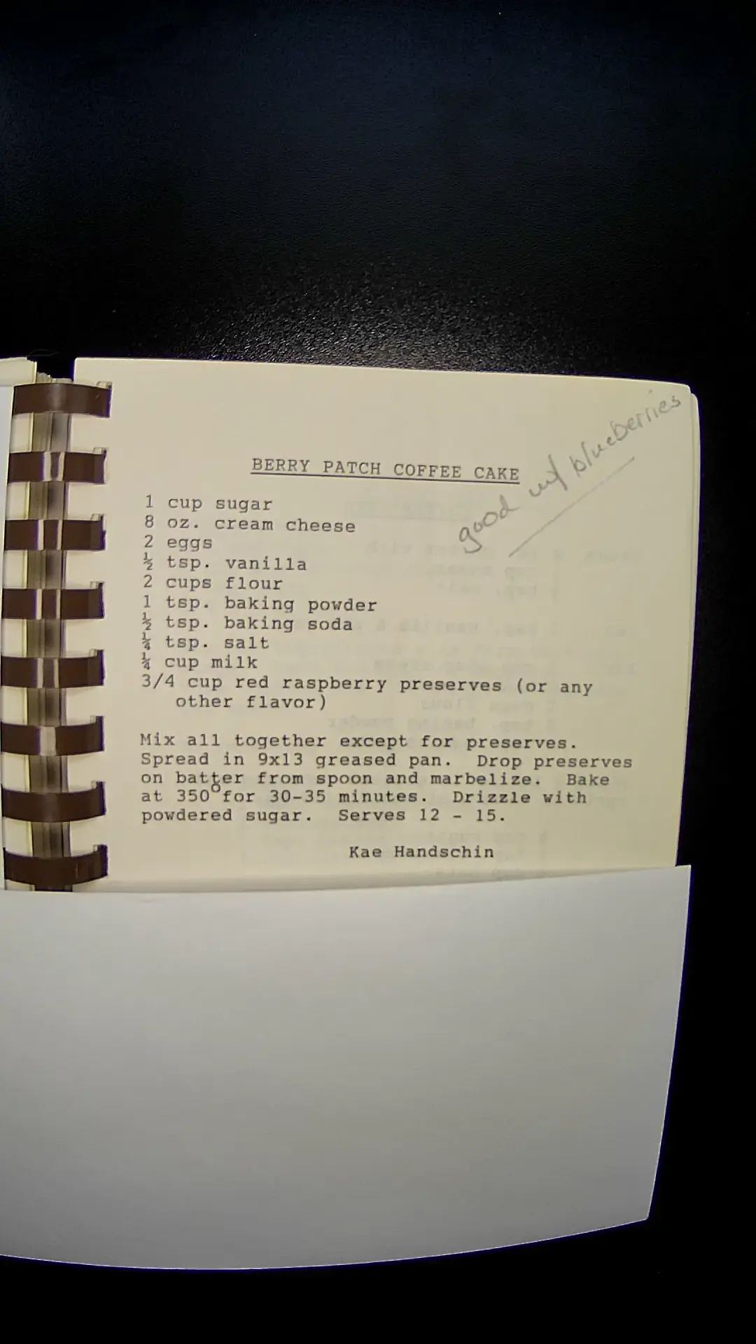 Sure! Here's the text from the image: **BERRY PATCH COFFEE CAKE** - 1 cup sugar - 8 oz. cream cheese - 2 eggs - ½ tsp. vanilla - 2 cups flour - 1 tsp. baking powder - ½ tsp. baking soda - ½ tsp. salt - ¾ cup milk - ¾ cup red raspberry preserves (or any other flavor) **Instructions:** Mix all together except for preserves. Spread in a 9x13 greased pan. Drop preserves on batter from spoon and marbleize. Bake at 350°F for 30-35 minutes. Drizzle with powdered sugar. Serves 12-15. *Kae Handschin*llm