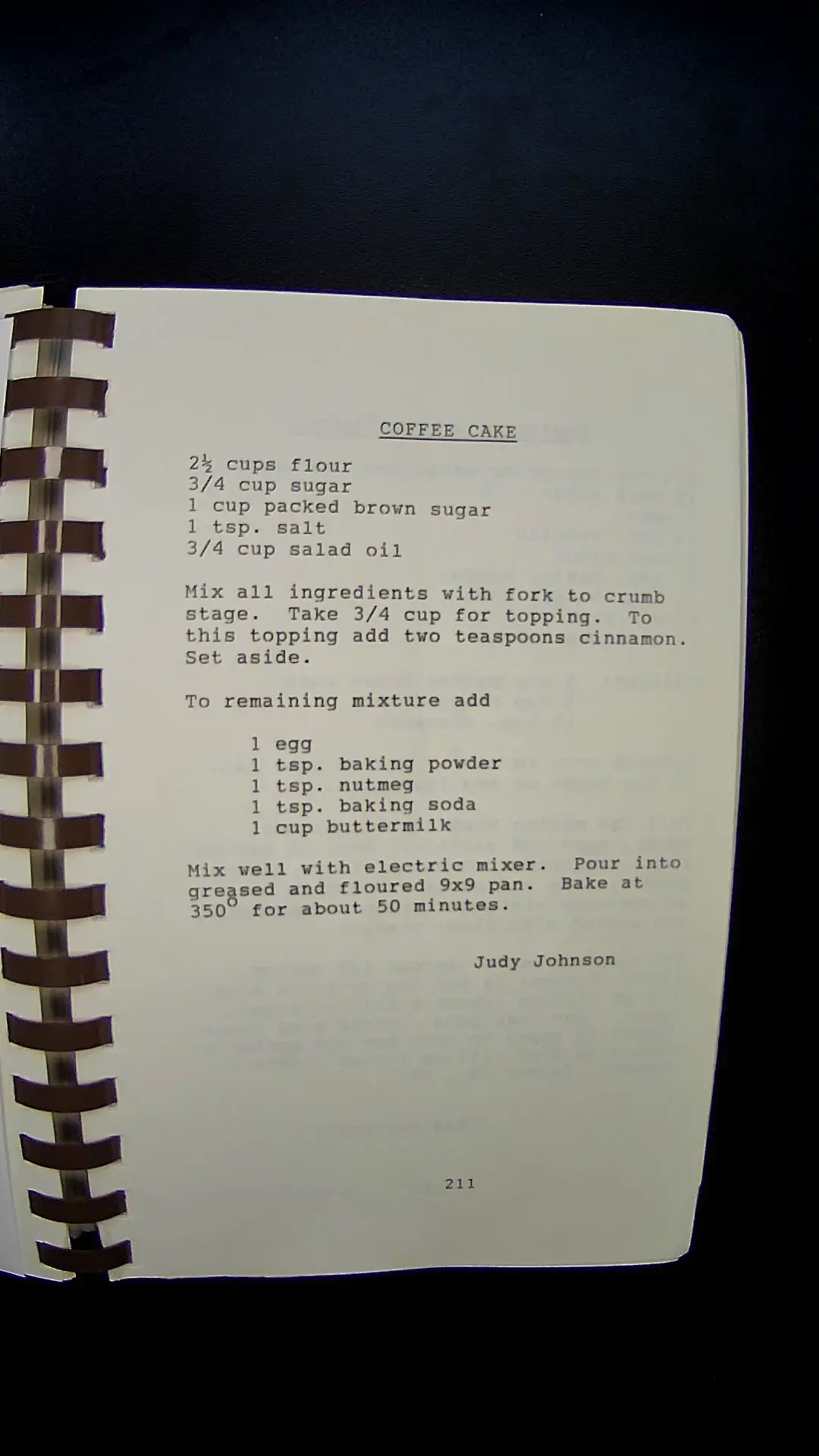 Here's the text from the image: --- **COFFEE CAKE** 2½ cups flour ¾ cup sugar 1 cup packed brown sugar 1 tsp. salt ¾ cup salad oil Mix all ingredients with fork to crumb stage. Take ¾ cup for topping. To this topping add two teaspoons cinnamon. Set aside. To remaining mixture add 1 egg 1 tsp. baking powder 1 tsp. nutmeg 1 tsp. baking soda 1 cup buttermilk Mix well with electric mixer. Pour into greased and floured 9x9 pan. Bake at 350° for about 50 minutes. Judy Johnson 211 ---llm