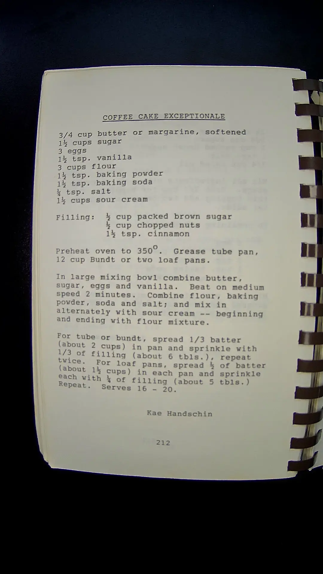 Sure! Here's the text from the image: --- **COFFEE CAKE EXCEPTIONALE** - 3/4 cup butter or margarine, softened - 1 1/2 cups sugar - 3 eggs - 1 1/2 tsp. vanilla - 3 cups flour - 1 1/2 tsp. baking powder - 1 1/2 tsp. baking soda - 1/2 tsp. salt - 1 1/2 cups sour cream **Filling:** - 1/2 cup packed brown sugar - 1/2 cup chopped nuts - 1 1/2 tsp. cinnamon Preheat oven to 350°. Grease tube pan, 12 cup Bundt or two loaf pans. In large mixing bowl combine butter, sugar, eggs and vanilla. Beat on medium speed 2 minutes. Combine flour, baking powder, soda and salt; and mix in alternately with sour cream—beginning and ending with flour mixture. For tube or bundt, spread 1/3 batter (about 2 cups) in pan and sprinkle with 1/3 of filling (about 6 tbls.), repeat twice. For loaf pans, spread 1/4 of batter (about 1 1/2 cups) in each pan and sprinkle each with 1/4 of filling (about 5 tbls.) Repeat. Serves 16 – 20. Kae Handschin 212llm