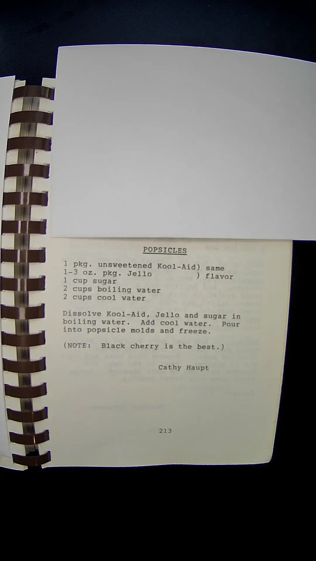 Here's the text from the image: **POPSICLES** 1 pkg. unsweetened Kool-Aid (same flavor) 1-3 oz. pkg. Jello 1 cup sugar 2 cups boiling water 2 cups cool water Dissolve Kool-Aid, Jello, and sugar in boiling water. Add cool water. Pour into popsicle molds and freeze. **(NOTE: Black cherry is the best.)** Cathy Haupt 213llm
