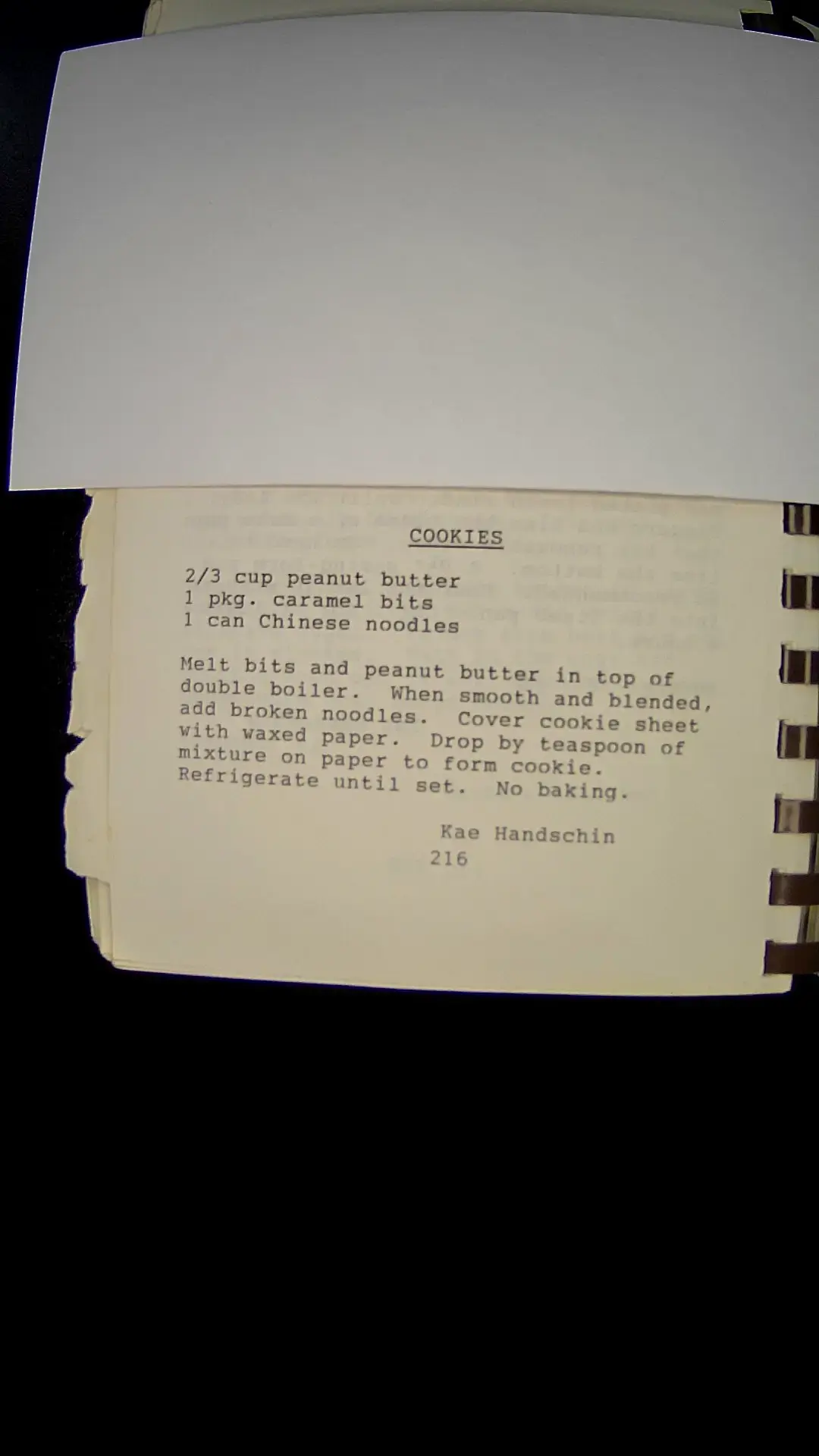 Here's the text from the image: **COOKIES** 2/3 cup peanut butter 1 pkg. caramel bits 1 can Chinese noodles Melt bits and peanut butter in top of double boiler. When smooth and blended, add broken noodles. Cover cookie sheet with waxed paper. Drop by teaspoon of mixture on paper to form cookie. Refrigerate until set. No baking. Kae Handschin 216llm