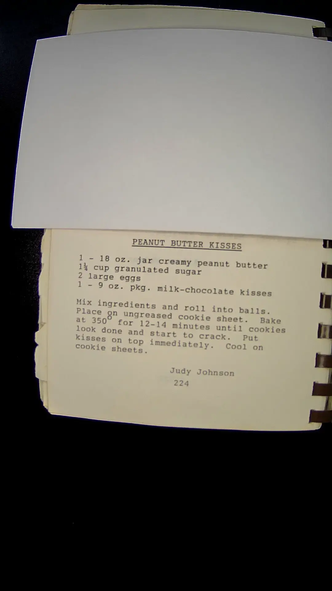 Here’s the text from the image: **PEANUT BUTTER KISSES** 1 - 18 oz. jar creamy peanut butter 1¼ cup granulated sugar 2 large eggs 1 - 9 oz. pkg. milk-chocolate kisses Mix ingredients and roll into balls. Place on ungreased cookie sheet. Bake at 350°F for 12-14 minutes until cookies look done and start to crack. Put kisses on top immediately. Cool on cookie sheets. **Judy Johnson** 224llm