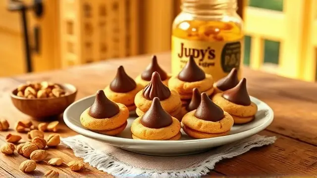 # Judy's Peanut Butter Kisses 🍪❤️ These delightful Peanut Butter Kisses are a timeless treat that blend the rich flavor of peanut butter with the sweetness of chocolate. Perfect for any occasion—from holidays to bake sales—these cookies are sure to become a family favorite! With a mere four ingredients and easy preparation, you’ll find yourself making these delicious bites again and again. 🥜🍫 ## Ingredients - 1 (18 oz.) jar creamy peanut butter - 1 ¼ cups granulated sugar - 2 large eggs - 1 (9 oz.) package milk chocolate kisses ## Instructions 1. **Preheat your oven** to 350°F (175°C). 2. In a large mixing bowl, **combine peanut butter, sugar, and eggs**. Mix until smooth and creamy. > 🥄 Make sure not to overmix as this can lead to denser cookies. A gentle hand is all that’s needed! 3. **Scoop the dough** and roll it into small balls, about 1 inch in diameter. 4. **Place the balls** on an ungreased cookie sheet, leaving space between them as they will spread. 5. **Bake** for 12-14 minutes, or until the cookies look set and begin to crack on top. 6. **Remove from the oven** and immediately press a chocolate kiss into the center of each cookie. Allow them to melt slightly and create a delicious topping. 7. **Let cool** on the cookie sheet for a few minutes before transferring to a wire rack. > ❄️ Cooling on the sheet first helps the cookies firm up, making them easier to transfer without breaking! ## Tips for the Perfect Kiss - **Storing**: Keep cookies in an airtight container for up to a week. They may also be frozen for longer freshness. - **Nut allergy alternative**: Substitute peanut butter with sunflower seed butter for nut-free cookies that still hit the sweet spot! - **Additional flavors**: Add a sprinkle of sea salt on top right after baking for a sweet and salty contrast. ## Variations - **Chocolate lovers**: For an extra indulgence, fold in some mini chocolate chips into the dough before rolling into balls. - **Chunky peanut butter version**: Use crunchy peanut butter instead of creamy for added texture. Just be aware that the cookies might spread differently! - **Holiday twist**: Shape the cookies into festive shapes with cookie cutters during the season, pressing the kisses in as before. ### Enjoy baking and sharing these scrumptious Peanut Butter Kisses with the people you love! Happy snacking! 🎉name