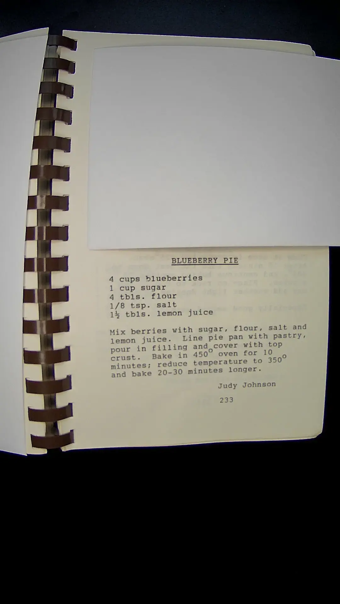 Here is the text from the image: **BLUEBERRY PIE** **Ingredients:** - 4 cups blueberries - 1 cup sugar - 4 tbls. flour - 1/8 tsp. salt - 1½ tbls. lemon juice **Instructions:** Mix berries with sugar, flour, salt, and lemon juice. Line pie pan with pastry, pour in filling, and cover with top crust. Bake in 450° oven for 10 minutes; reduce temperature to 350° and bake 20-30 minutes longer. Judy Johnson 233llm