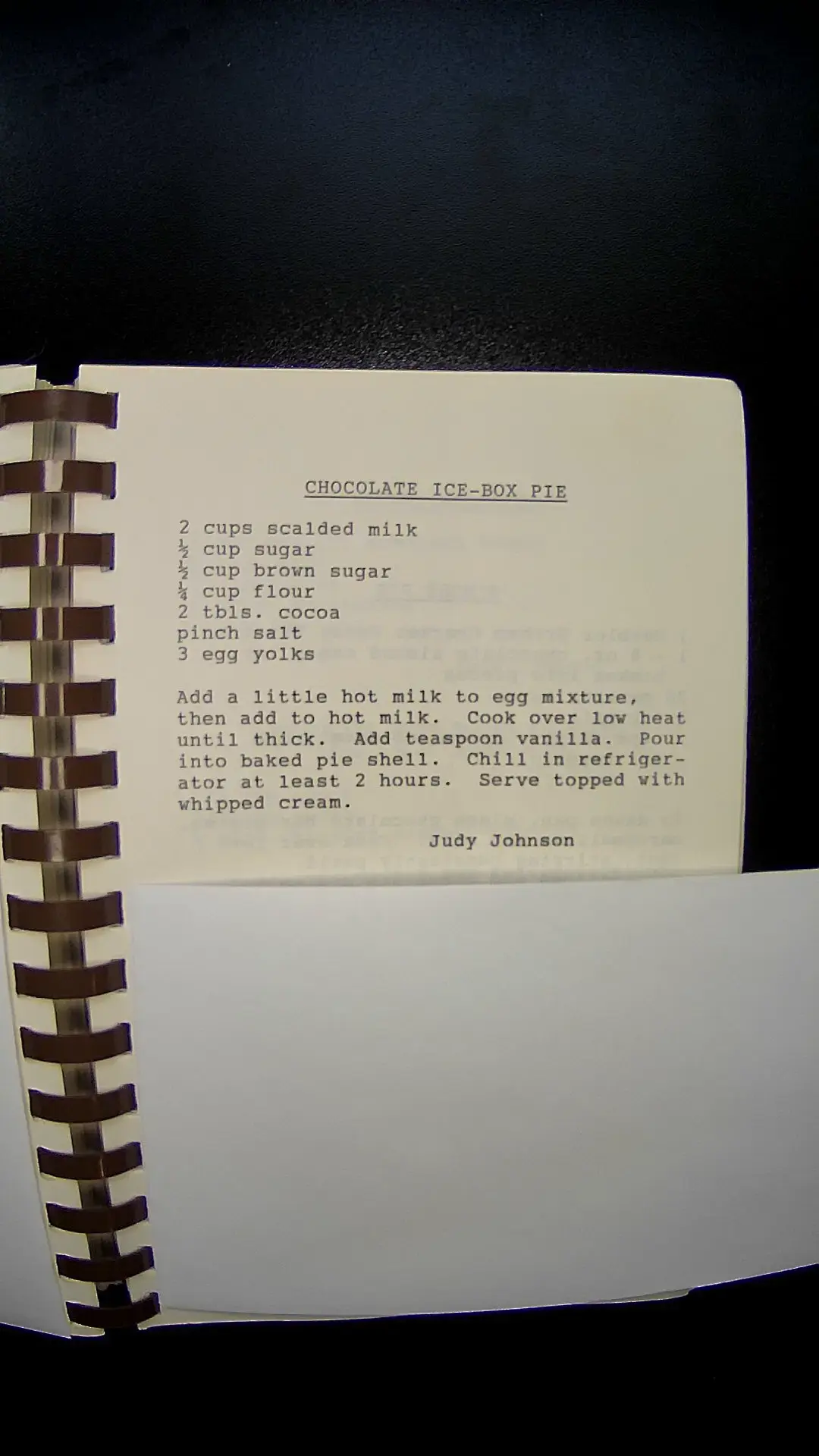 Here is the text from the image: **CHOCOLATE ICE-BOX PIE** - 2 cups scalded milk - Β½ cup sugar - Β½ cup brown sugar - ΒΌ cup flour - 2 tbls. cocoa - pinch salt - 3 egg yolks Add a little hot milk to egg mixture, then add to hot milk. Cook over low heat until thick. Add teaspoon vanilla. Pour into baked pie shell. Chill in refrigerator at least 2 hours. Serve topped with whipped cream. **Judy Johnson**llm