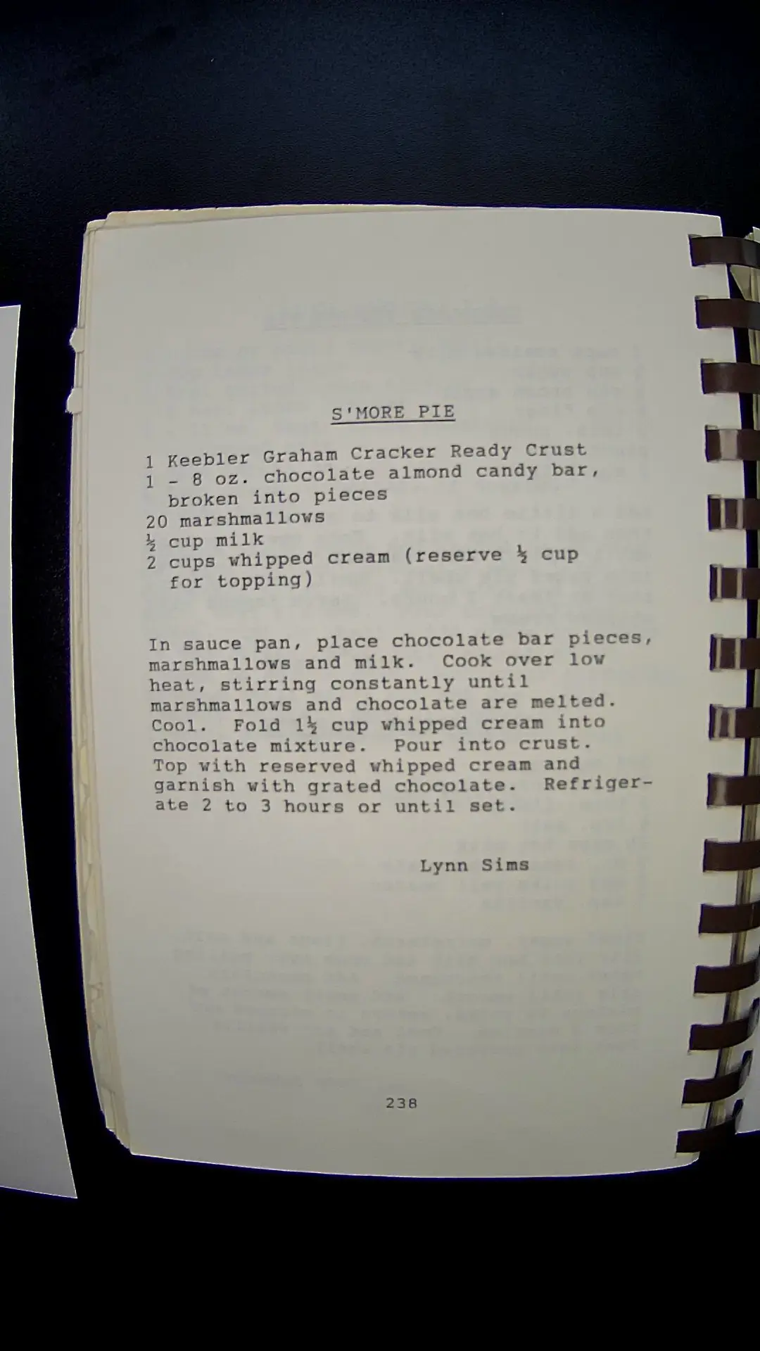 Here’s the text from the image: **S'MORE PIE** 1 Keebler Graham Cracker Ready Crust 1 - 8 oz. chocolate almond candy bar, broken into pieces 20 marshmallows ½ cup milk 2 cups whipped cream (reserve ½ cup for topping) In a saucepan, place chocolate bar pieces, marshmallows, and milk. Cook over low heat, stirring constantly until marshmallows and chocolate are melted. Cool. Fold 1½ cups whipped cream into chocolate mixture. Pour into crust. Top with reserved whipped cream and garnish with grated chocolate. Refrigerate 2 to 3 hours or until set. **Lynn Sims** 238llm