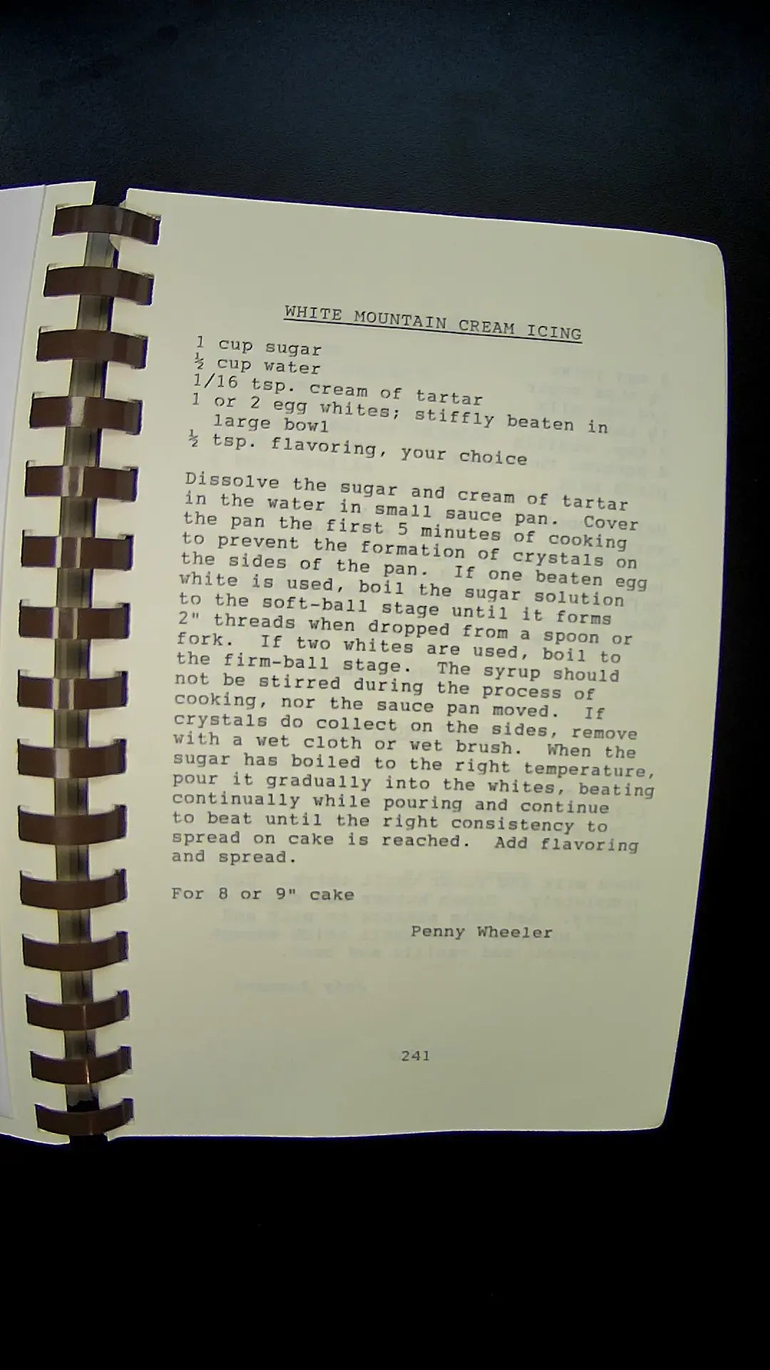 Here is the text from the image: --- **WHITE MOUNTAIN CREAM ICING** 1 cup sugar ½ cup water 1/16 tsp. cream of tartar 1 or 2 egg whites; stiffly beaten in large bowl ½ tsp. flavoring, your choice Dissolve the sugar and cream of tartar in the water in small sauce pan. Cover the pan for the first 5 minutes of cooking to prevent the formation of crystals on the sides of the pan. If one beaten egg white is used, boil the sugar solution to the soft-ball stage until it forms 2" threads when dropped from a spoon or fork. If two whites are used, boil to the firm-ball stage. The syrup should not be stirred during the process of cooking, nor the sauce pan moved. If crystals do collect on the sides, remove with a wet cloth or wet brush. When the sugar has boiled to the right temperature, pour it gradually into the whites, beating continually while pouring and continue to beat until the right consistency to spread on cake is reached. Add flavoring and spread. For 8 or 9" cake Penny Wheeler 241 ---llm