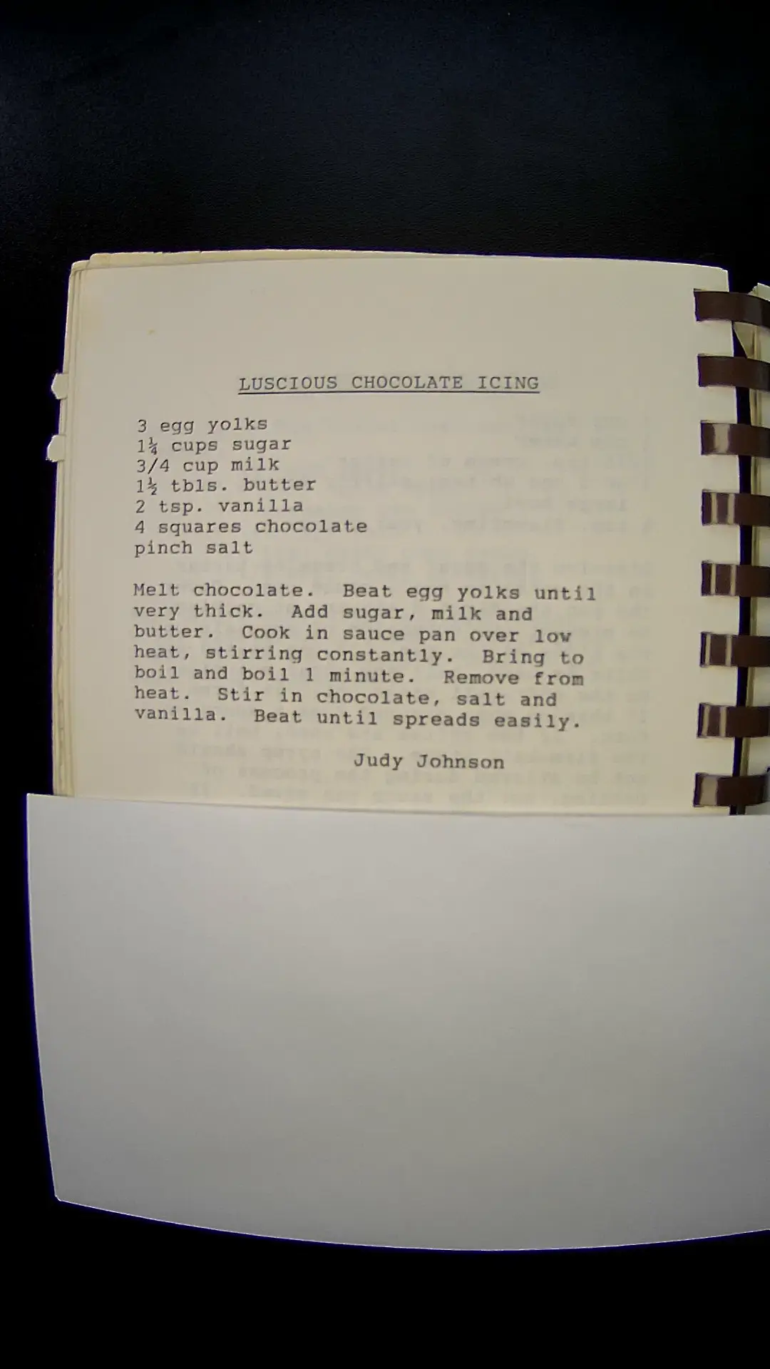 Here's the text you provided: **LUSCIOUS CHOCOLATE ICING** - 3 egg yolks - 1¾ cups sugar - ¾ cup milk - 1½ tbls. butter - 2 tsp. vanilla - 4 squares chocolate - pinch salt **Instructions:** Melt chocolate. Beat egg yolks until very thick. Add sugar, milk, and butter. Cook in saucepan over low heat, stirring constantly. Bring to boil and boil 1 minute. Remove from heat. Stir in chocolate, salt, and vanilla. Beat until spreads easily. **Judy Johnson**llm