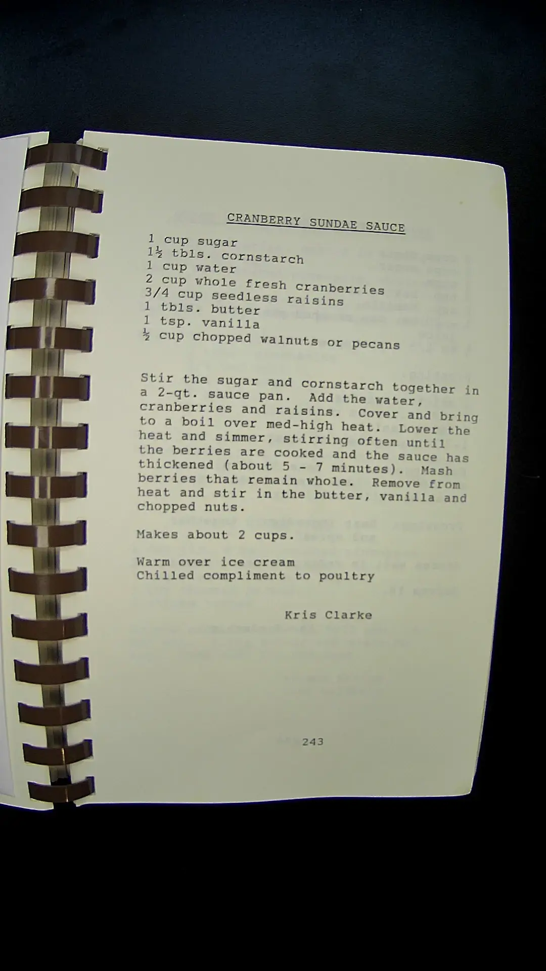 Here's the text from the image: **CRANBERRY SUNDAE SAUCE** 1 cup sugar 1½ tables. cornstarch 1 cup water 2 cups whole fresh cranberries ¾ cup seedless raisins 1 tables. butter 1 tsp. vanilla ½ cup chopped walnuts or pecans Stir the sugar and cornstarch together in a 2-qt. sauce pan. Add the water, cranberries, and raisins. Cover and bring to a boil over med-high heat. Lower the heat and simmer, stirring often until the berries are cooked and the sauce has thickened (about 5-7 minutes). Mash berries that remain whole. Remove from heat and stir in the butter, vanilla, and chopped nuts. Makes about 2 cups. Warm over ice cream Chilled compliment to poultry Kris Clarke 243llm
