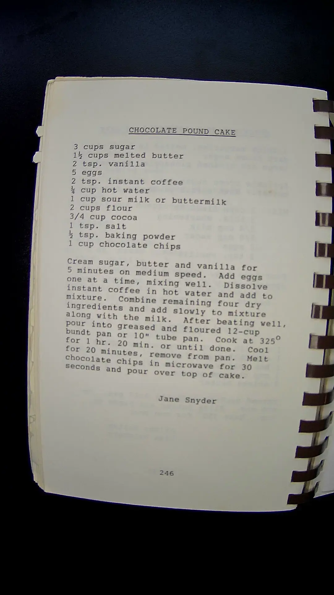 Here's the text from the image: **CHOCOLATE POUND CAKE** - 3 cups sugar - 1½ cups melted butter - 2 tsp. vanilla - 5 eggs - 2 tsp. instant coffee - ¼ cup hot water - 1 cup sour milk or buttermilk - 2 cups flour - ¾ cup cocoa - 1 tsp. salt - ½ tsp. baking powder - 1 cup chocolate chips **Instructions:** Cream sugar, butter, and vanilla for 5 minutes on medium speed. Add eggs one at a time, mixing well. Dissolve instant coffee in hot water and add to mixture. Combine remaining four dry ingredients and add slowly to mixture along with the milk. After beating well, pour into greased and floured 12-cup bundt pan or 10" tube pan. Cook at 325° for 1 hr. 20 min. or until done. Cool for 20 minutes, remove from pan. Melt chocolate chips in microwave for 30 seconds and pour over top of cake. **Jane Snyder** 246llm