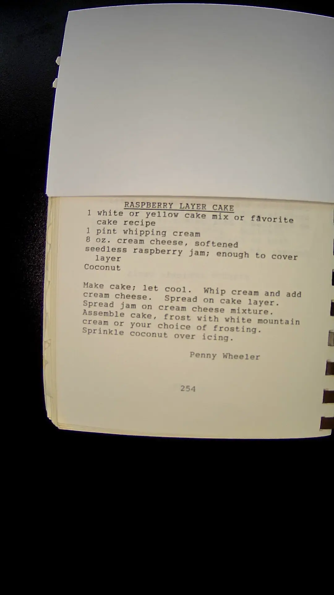 Sure! Hereβs the text from the image: **Raspberry Layer Cake** - 1 white or yellow cake mix or favorite cake recipe - 1 pint whipping cream - 8 oz. cream cheese, softened - Seedless raspberry jam; enough to cover layer - Coconut **Instructions:** 1. Make cake; let cool. Whip cream and add cream cheese. Spread on cake layer. 2. Spread jam on cream cheese mixture. 3. Assemble cake, frost with white mountain cream or your choice of frosting. 4. Sprinkle coconut over icing. Penny Wheeler 254llm
