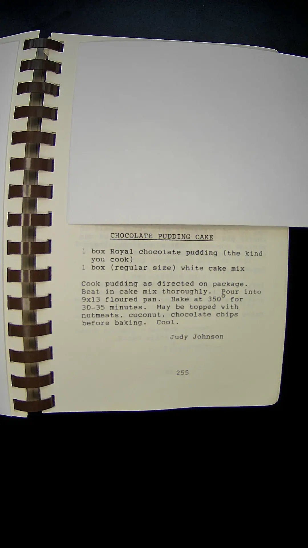 Here’s the text from the image: **CHOCOLATE PUDDING CAKE** 1 box Royal chocolate pudding (the kind you cook) 1 box (regular size) white cake mix Cook pudding as directed on package. Beat in cake mix thoroughly. Pour into 9x13 floured pan. Bake at 350°F for 30-35 minutes. May be topped with nuts, coconut, chocolate chips before baking. Cool. **Judy Johnson** 255llm
