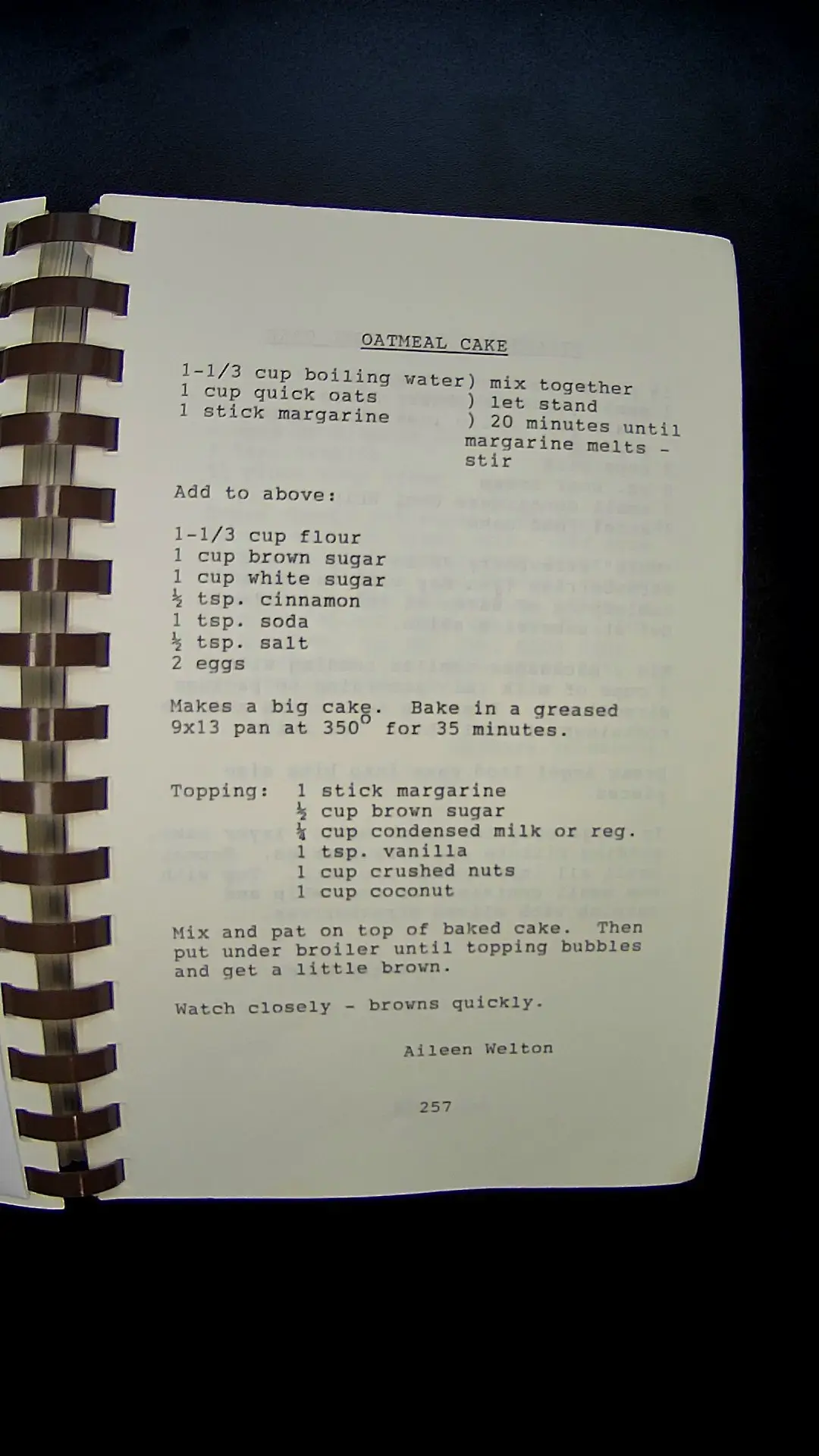 Here's the text from the image: **OATMEAL CAKE** 1-1/3 cup boiling water) mix together 1 cup quick oats ) let stand 1 stick margarine ) 20 minutes until margarine melts - stir Add to above: 1-1/3 cup flour 1 cup brown sugar 1 cup white sugar ½ tsp. cinnamon 1 tsp. soda ½ tsp. salt 2 eggs Makes a big cake. Bake in a greased 9x13 pan at 350° for 35 minutes. **Topping:** 1 stick margarine ½ cup brown sugar ⅓ cup condensed milk or reg. 1 tsp. vanilla 1 cup crushed nuts 1 cup coconut Mix and pat on top of baked cake. Then put under broiler until topping bubbles and get a little brown. Watch closely - browns quickly. Aileen Welton 257llm