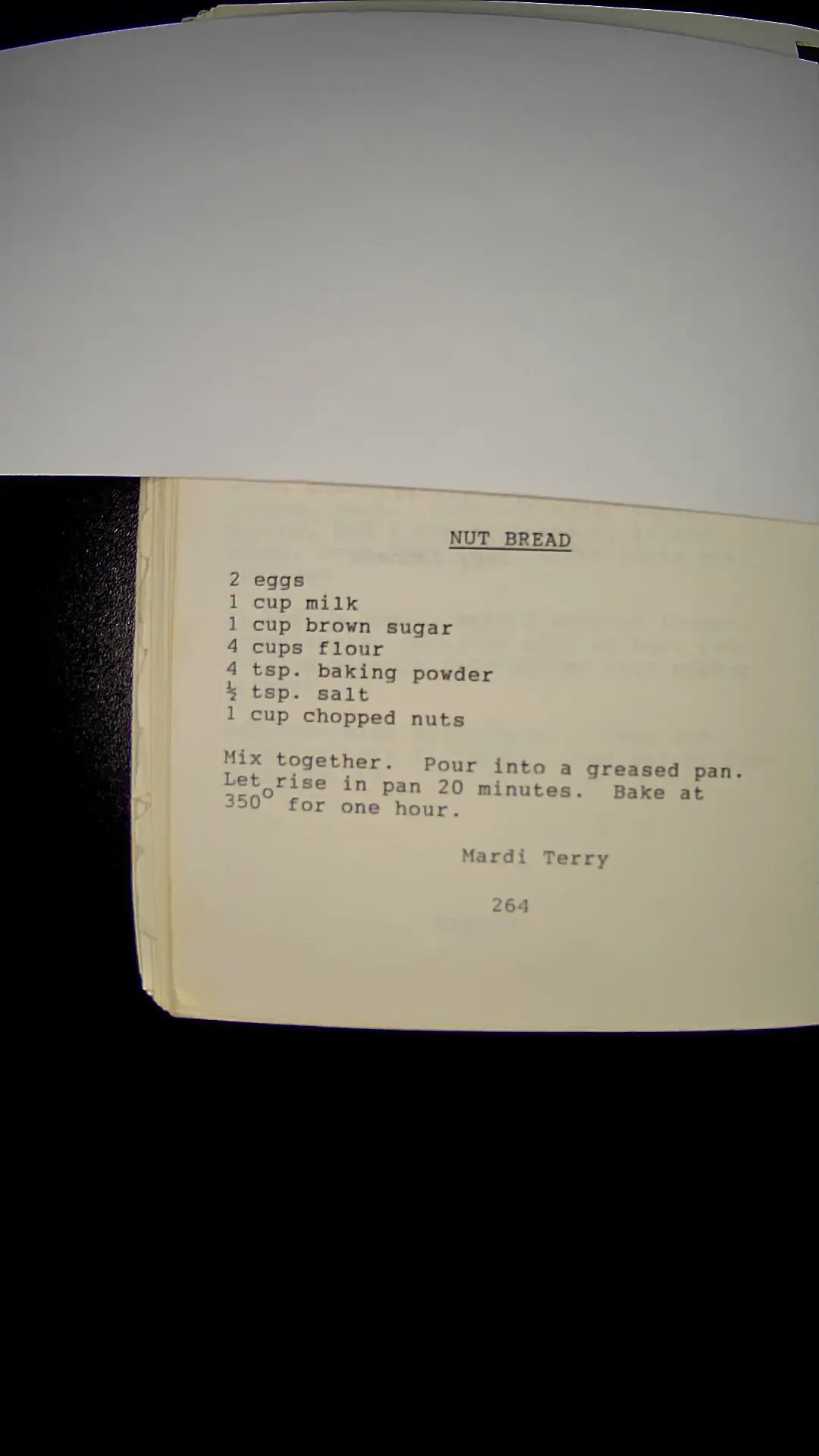 Here's the text from the image: **NUT BREAD** 2 eggs 1 cup milk 1 cup brown sugar 4 cups flour 4 tsp. baking powder Β½ tsp. salt 1 cup chopped nuts Mix together. Pour into a greased pan. Let rise in pan 20 minutes. Bake at 350Β° for one hour. Mardi Terry 264llm