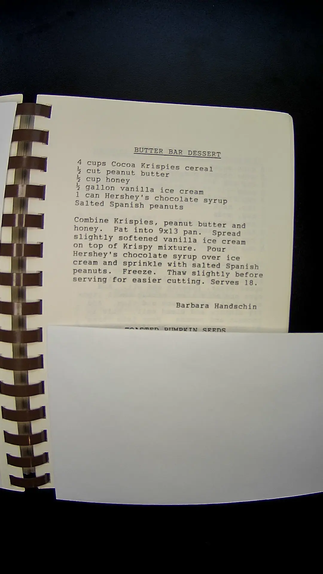 Here’s the text from the image: ### BUTTER BAR DESSERT - 4 cups Cocoa Krispies cereal - ½ cup peanut butter - ½ cup honey - 1 ½ gallon vanilla ice cream - 1 can Hershey's chocolate syrup - Salted Spanish peanuts **Instructions:** Combine Krispies, peanut butter, and honey. Pat into 9x13 pan. Spread slightly softened vanilla ice cream on top of Krispy mixture. Pour Hershey's chocolate syrup over ice cream and sprinkle with salted Spanish peanuts. Freeze. Thaw slightly before serving for easier cutting. Serves 18. Barbara Handschinllm