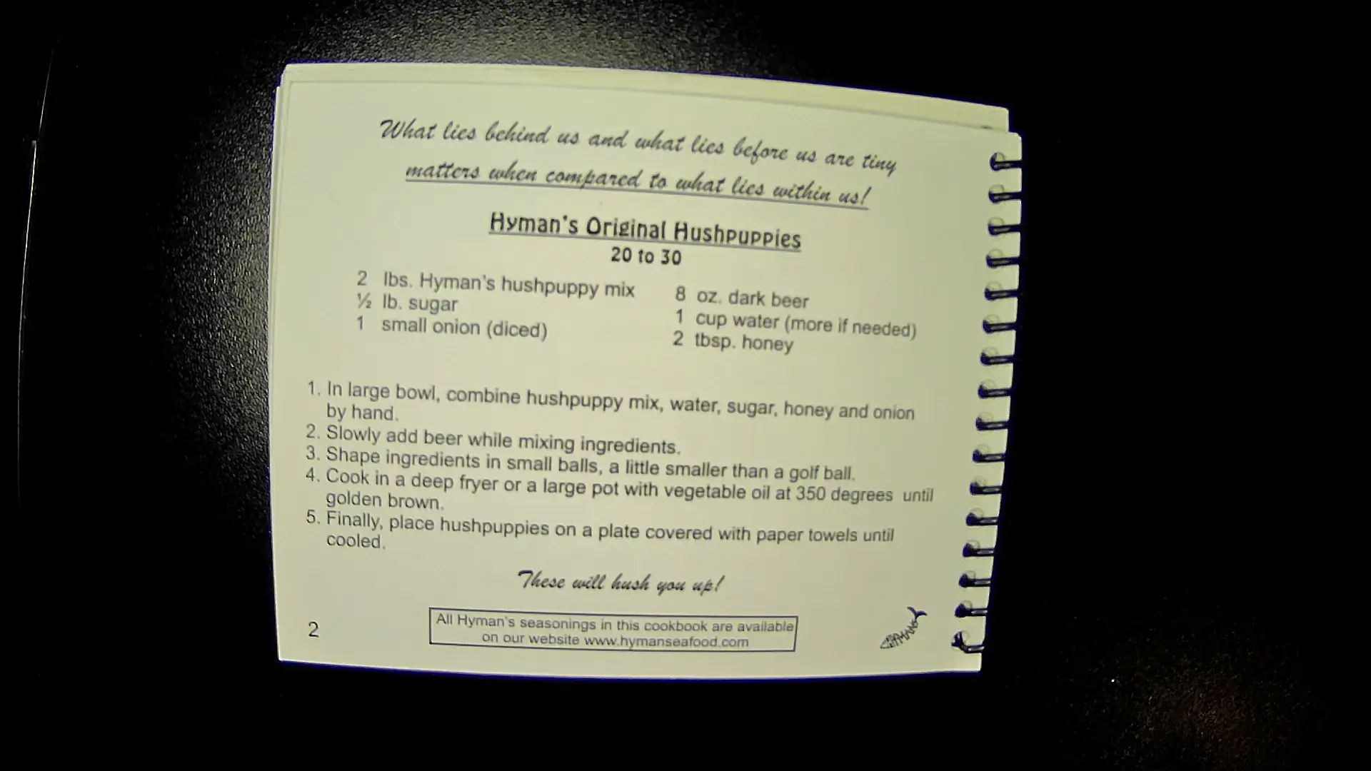 Here's the text from the image: --- What lies behind us and what lies before us are tiny matters when compared to what lies within us! **Hyman’s Original Hushpuppies** 20 to 30 servings **Ingredients:** - 2 lbs Hyman's hushpuppy mix - ½ lb sugar - 1 small onion (diced) - 8 oz dark beer - 1 cup water (more if needed) - 2 tbsp honey **Instructions:** 1. In a large bowl, combine hushpuppy mix, water, sugar, honey, and onion by hand. 2. Slowly add beer while mixing ingredients. 3. Shape ingredients in small balls, a little smaller than a golf ball. 4. Cook in a deep fryer or a large pot with vegetable oil at 350 degrees until golden brown. 5. Finally, place hushpuppies on a plate covered with paper towels until cooled. --- There will hush you up! All Hyman's accompaniments in this cookbook are available on our website www.hymansincluded.comllm