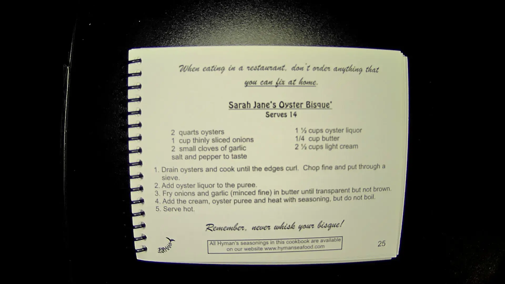 Here’s the text from the image: --- **When eating in a restaurant, don't order anything that you can fix at home.** **Sarah Jane's Oyster Bisque** *Serves 14* - 2 quarts oysters - 1 cup thinly sliced onions - 2 small cloves of garlic - salt and pepper to taste - 1 ½ cup oyster liquor - ¼ cup butter - 2 ½ cups light cream 1. Drain oysters and cook until the edges curl. Chop fine and put through a sieve. 2. Add oyster liquor to the puree. 3. Fry onions and garlic (minced fine) in butter until transparent but not brown. 4. Add the cream, oyster puree and heat with seasoning, but do not boil. 5. Serve hot. --- *Remember, never whisk your bisque!* --- *All Hyman's seasonings in this cookbook are available on our website www.hymansealord.com* --- (Note: The formatting may vary slightly from the original image.)llm