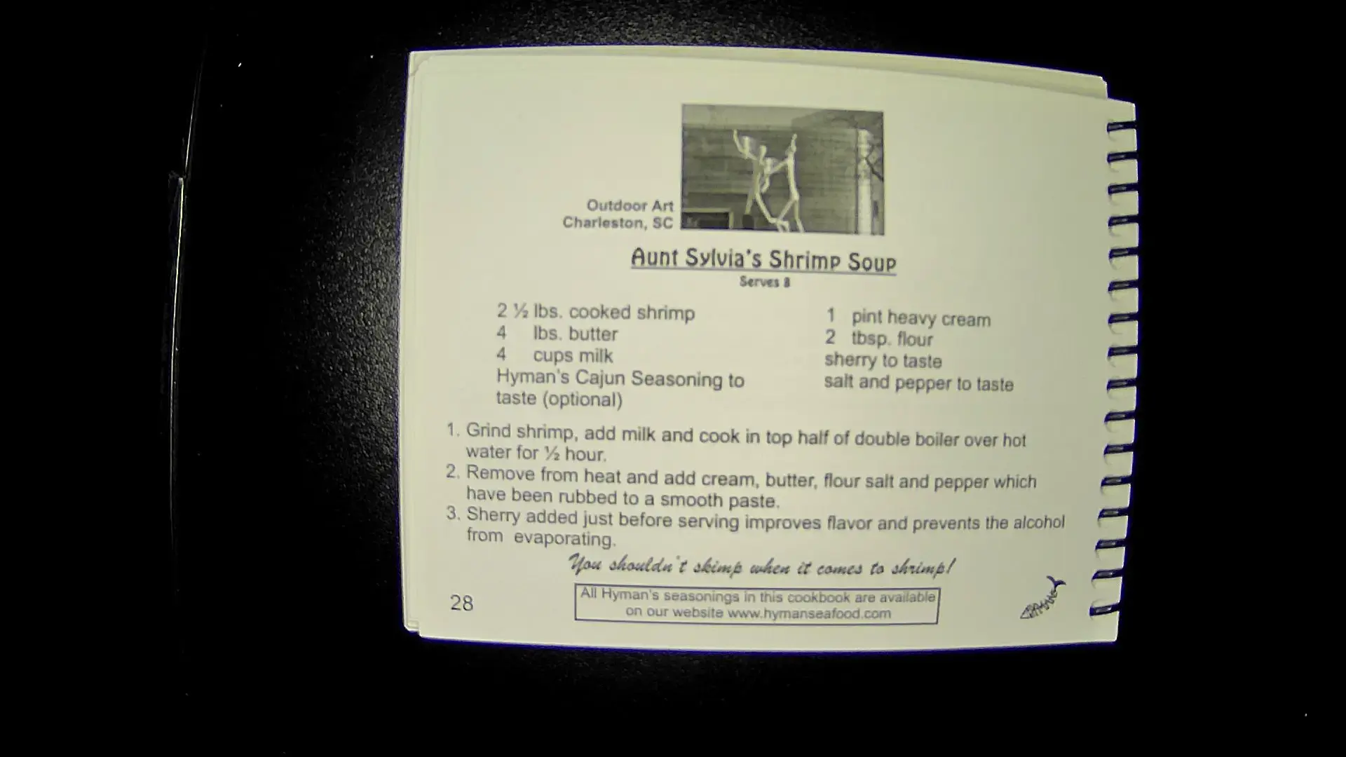 Here’s the text from the image: --- **Aunt Sylvia's Shrimp Soup** **Ingredients:** - 2¼ lbs. cooked shrimp - 4 lbs. butter - 4 cups milk - Hyman's Cajun Seasoning to taste (optional) - 1 pint heavy cream - 2 tbsp. flour - sherry to taste - salt and pepper to taste **Instructions:** 1. Grind shrimp, add milk and cook in top half of double boiler over hot water for ½ hour. 2. Remove from heat and add cream, butter, flour, salt and pepper which have been rubbed to a smooth paste. 3. Sherry added just before serving improves flavor and prevents the alcohol from evaporating. All Hyman's is available in this cookbook as well as on our website: www.hymans.com --- **Page 28** --- If you need anything else, feel free to ask!llm