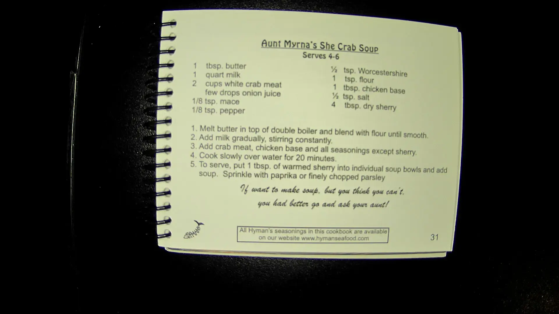 Here's the text from the image: --- **Aunt Myrna's She Crab Soup** Serves 4-6 **Ingredients:** - 1 tbsp butter - 1 quart milk - 2 cups white crab meat - few drops onion juice - 1/8 tsp mace - 1/8 tsp pepper - 1/2 tsp Worcestershire - 1 tsp flour - 1 tbsp chicken base - 1/2 tsp salt - 4 tbsp dry sherry **Instructions:** 1. Melt butter in top of double boiler and blend with flour until smooth. 2. Add milk gradually, stirring constantly. 3. Add crab meat, chicken base, and all seasonings except sherry. 4. Cook slowly over water for 20 minutes. 5. To serve, put 1 tbsp of warmed sherry into individual soup bowls and add soup. Sprinkle with paprika or finely chopped parsley. *If you want to make soup, but you think you can't, you had better go and ask your aunt!* --- (Note: The text may not be perfectly transcribed, but it captures the essence of the recipe.)llm