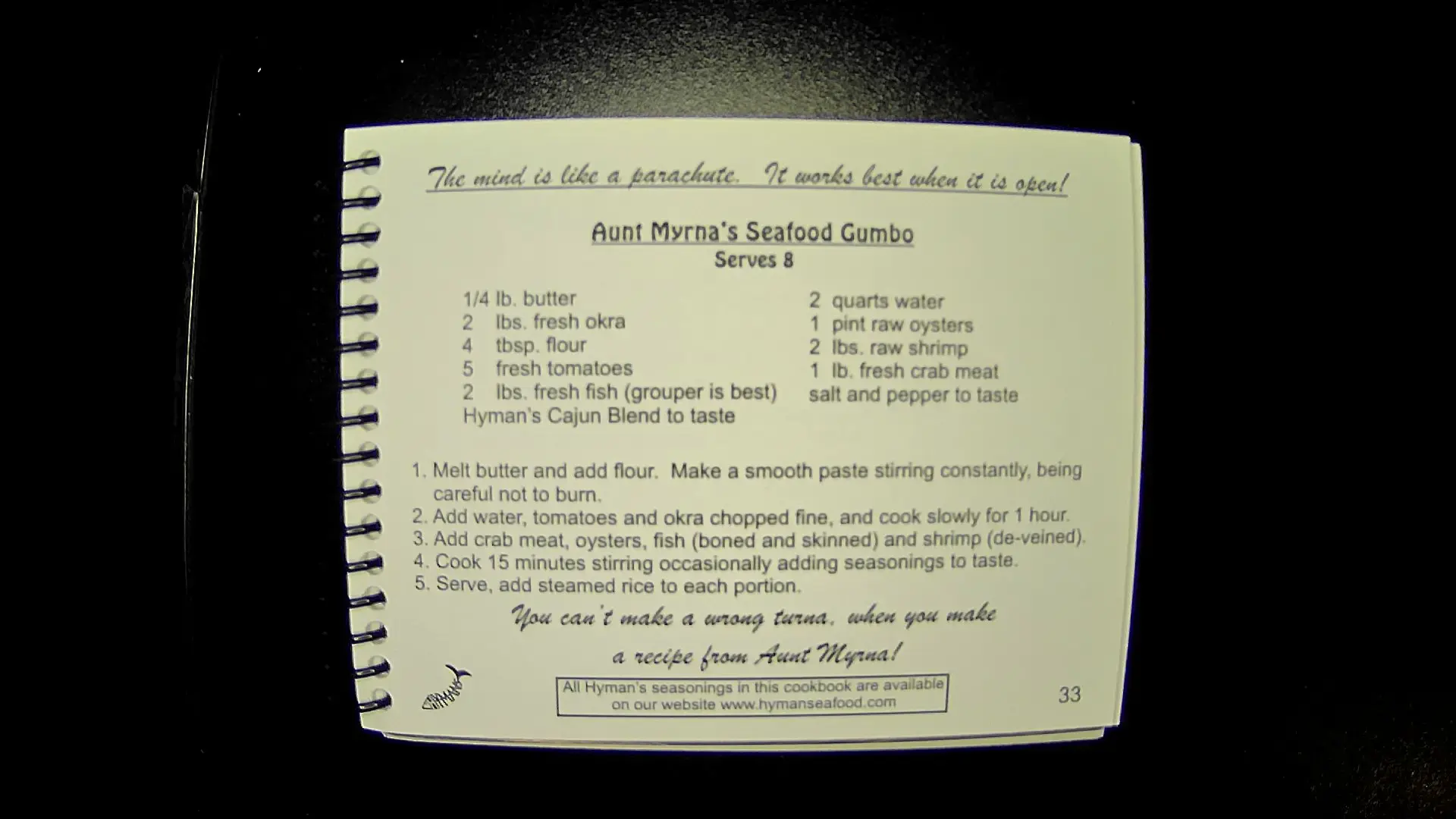 Sure! Here’s the text from the image: --- **Aunt Myrna's Seafood Gumbo** **Serves 8** **Ingredients:** - 1/4 lb. butter - 2 lbs fresh okra - 4 tbsp flour - 5 fresh tomatoes - 2 lbs fresh fish (grouper is best) - Hyman's Cajun Blend to taste - 2 quarts water - 1 pint raw oysters - 2 lbs raw shrimp - 1 lb. fresh crab meat - salt and pepper to taste **Instructions:** 1. Melt butter and add flour. Make a smooth paste stirring constantly, being careful not to burn. 2. Add water, tomatoes, and okra chopped fine, and cook slowly for 1 hour. 3. Add crab meat, oysters, fish (boned and skinned), and shrimp (de-veined). 4. Cook 15 minutes, stirring occasionally and adding seasonings to taste. 5. Serve, add steamed rice to each portion. --- *You can't make a wrong turn when you make a recipe from Aunt Myrna!* --- All Hyman's seasonings in this cookbook are available on our website www.hymansseafood.com.llm