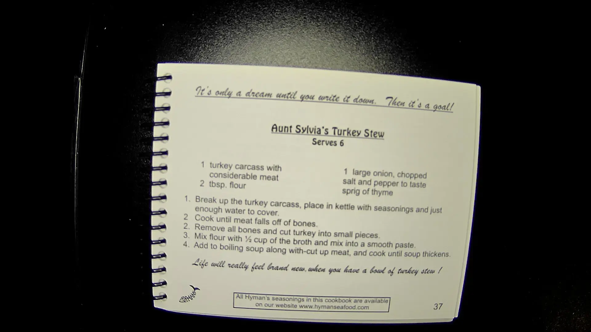 Sure! Hereβs the text from the image: --- **Aunt Sylvia's Turkey Stew** **Serves 6** **Ingredients:** 1. 1 turkey carcass with considerable meat 2. 2 tbsp. flour 3. 1 large onion, chopped 4. Salt and pepper to taste 5. 1 sprig of thyme **Instructions:** 1. Break up the turkey carcass, place in kettle with seasonings and just enough water to cover. 2. Cook until meat falls off bones. 3. Remove all bones and cut turkey into small pieces. 4. Mix flour with Β½ cup of the broth and mix into a smooth paste. 5. Add to boiling soup along with cut-up meat, and cook until soup thickens. *Life will really feel brand new when you have a bowl of turkey stew!* --- Let me know if you need anything else!llm