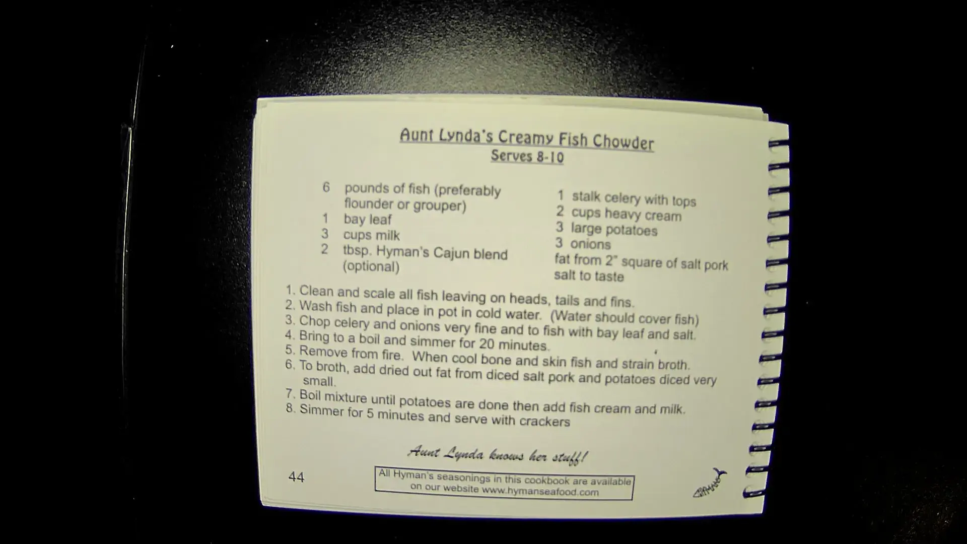 Here's the text from the image: --- **Aunt Lynda’s Creamy Fish Chowder** Serves 8-10 **Ingredients:** - 6 pounds of fish (preferably flounder or grouper) - 1 bay leaf - 3 cups milk - 2 tbsp. Hyman’s Cajun blend (optional) - 1 stalk celery with tops - 2 cups heavy cream - 3 large potatoes - 3 onions - Fat from 2" square of salt pork - Salt to taste **Instructions:** 1. Clean and scale all fish leaving on heads, tails, and fins. 2. Wash fish and place in pot in cold water. (Water should cover fish) 3. Chop celery and onions very fine and to fish with bay leaf and salt. 4. Bring to a boil and simmer for 20 minutes. 5. Remove from fire. When cool, bone and skin fish and strain broth small. 6. To broth, add dried out fat from diced salt pork and potatoes diced very small. 7. Boil mixture until potatoes are done then add fish cream and milk. 8. Simmer for 5 minutes and serve with crackers. --- **Aunt Lynda knows her stuff!** ---llm