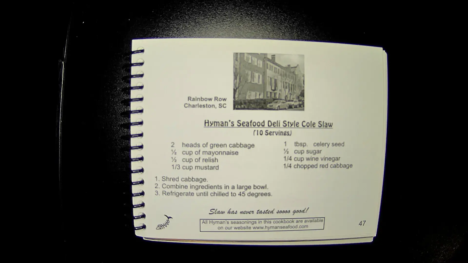 Here's the text from the image: --- **Hyman's Seafood Deli Style Cole Slaw** *(10 Servings)* **Ingredients:** - 2 heads of green cabbage - ½ cup of mayonnaise - ½ cup of relish - ⅓ cup mustard - 1 tbsp. celery seed - ¼ cup sugar - ¼ cup wine vinegar - ¼ chopped red cabbage **Instructions:** 1. Shred cabbage. 2. Combine ingredients in a large bowl. 3. Refrigerate until chilled to 45 degrees. **Slaw has never tasted this good!** --- Rainbow Row Charleston, SCllm