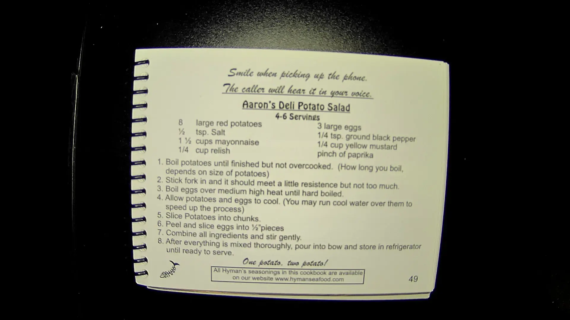 Here's the text from the image: --- **Aaron's Deli Potato Salad** 4-6 Servings - 8 large red potatoes - 1½ tsp. Salt - 1½ cups mayonnaise - ¼ cup relish - 3 large eggs - ¼ tsp. ground black pepper - ¼ cup yellow mustard - pinch of paprika 1. Boil potatoes until finished but not overcooked. (How long you boil depends on size of potatoes) 2. Stick fork in and it should meet a little resistance but not too much. 3. Boil eggs over medium-high heat until hard boiled. 4. Allow potatoes and eggs to cool. (You may run cool water over them to speed up the process) 5. Slice potatoes into chunks. 6. Peel and slice eggs into ½ pieces. 7. Combine all ingredients and stir gently. 8. After everything is mixed thoroughly, pour into bowl and store in refrigerator until ready to serve. --- *One potato, two potato!* *All Hyman's seasonings in this cookbook are available on our website www.hymansfood.com* 49llm