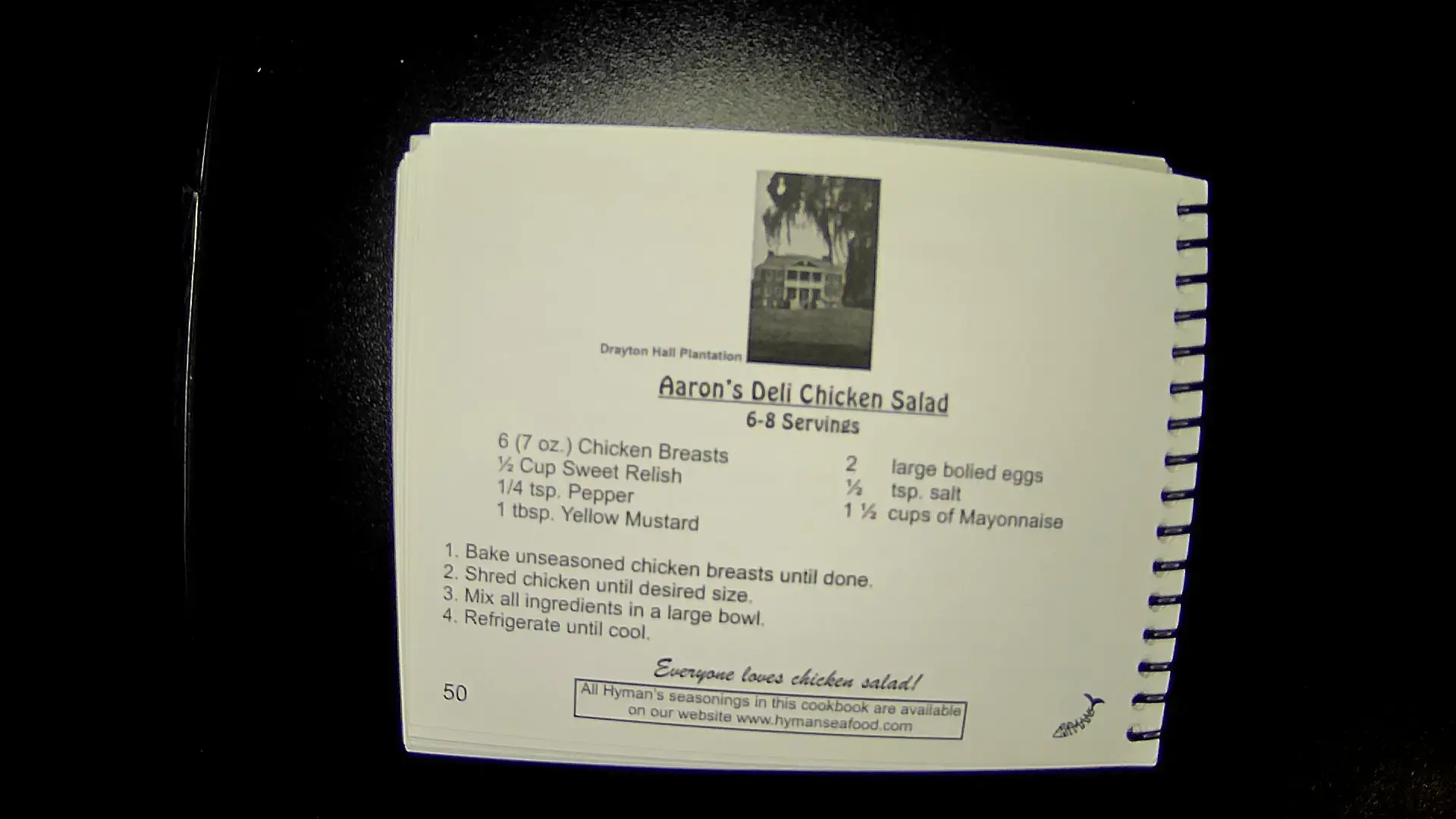 Here's the text from the image: --- **Aaron's Deli Chicken Salad** **6-8 Servings** - 6 (7 oz) Chicken Breasts - ½ Cup Sweet Relish - ¼ tsp. Pepper - 1 tbsp. Yellow Mustard - 2 large boiled eggs - ½ tsp. salt - 1 ½ cups of Mayonnaise **Instructions:** 1. Bake unseasoned chicken breasts until done. 2. Shred chicken until desired size. 3. Mix all ingredients in a large bowl. 4. Refrigerate until cool. --- **Everyone loves chicken salad!**llm