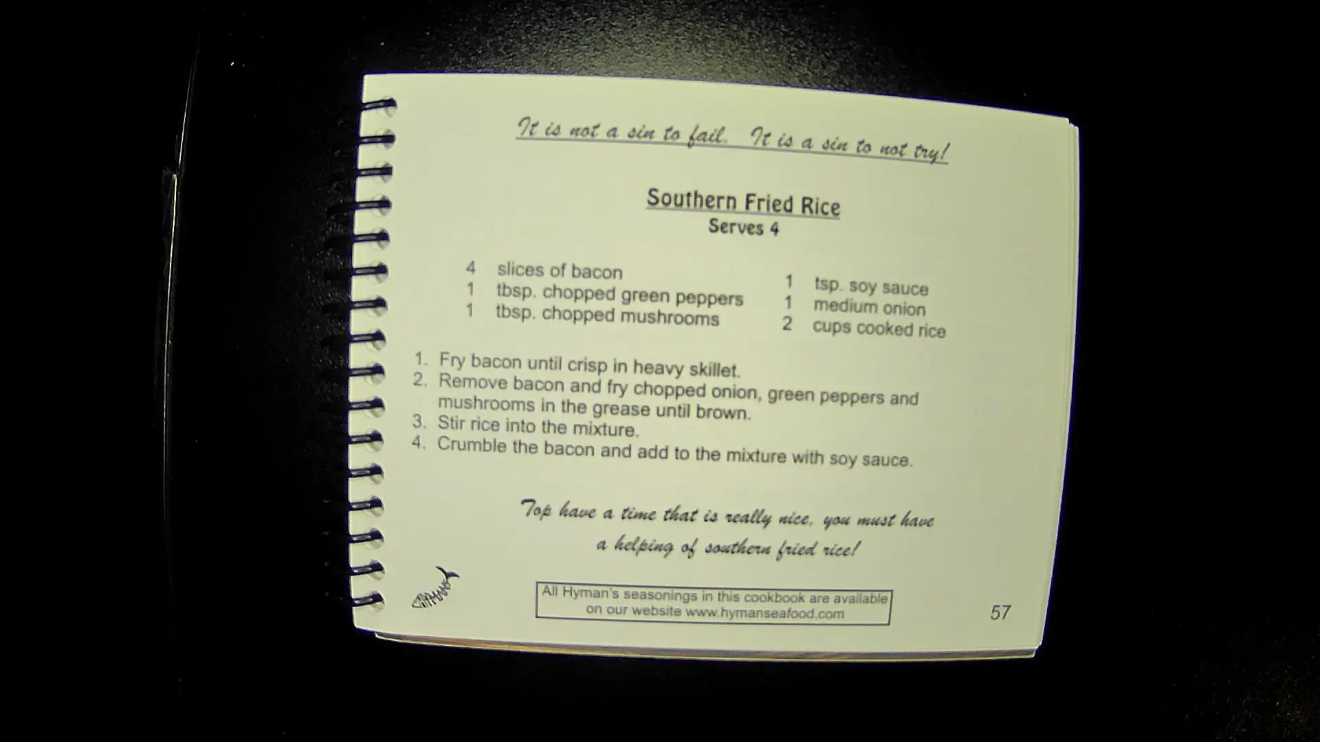Here's the text from the image: --- **It is not a sin to fail. It is a sin to not try!** **Southern Fried Rice** **Serves 4** - 4 slices of bacon - 1 tbsp. chopped green peppers - 1 tbsp. chopped mushrooms - 1 tsp. soy sauce - 1 medium onion - 2 cups cooked rice **Instructions:** 1. Fry bacon until crisp in heavy skillet. 2. Remove bacon and fry chopped onion, green peppers, and mushrooms in the grease until brown. 3. Stir rice into the mixture. 4. Crumble the bacon and add to the mixture with soy sauce. **Top have a time that is really nice, you must have a helping of southern fried rice!** --- **All Hyman's recipes in this cookbook are available on our website www.hymansfood.com** **57**llm