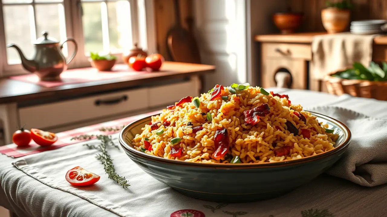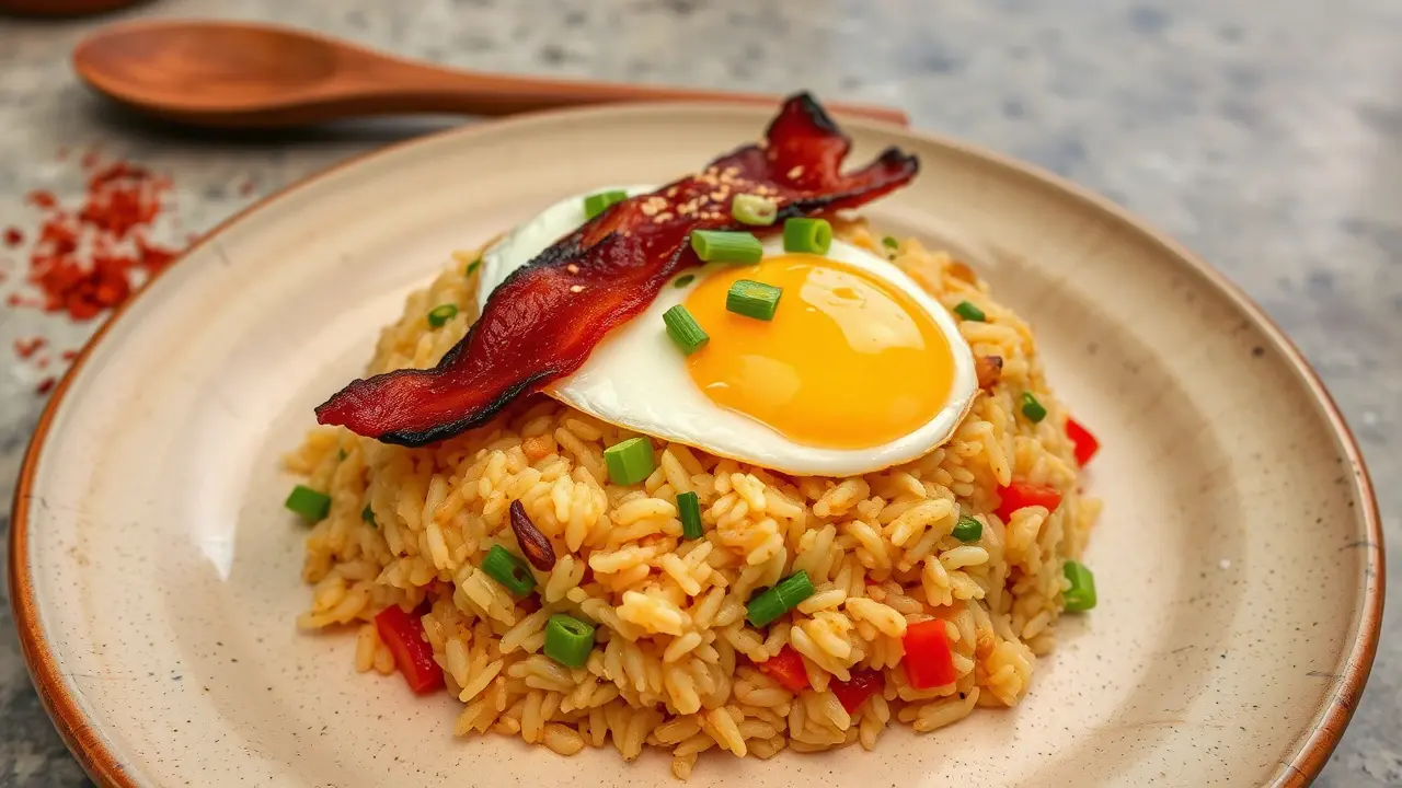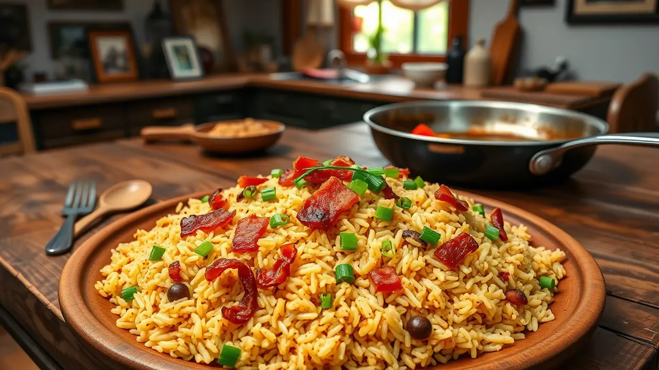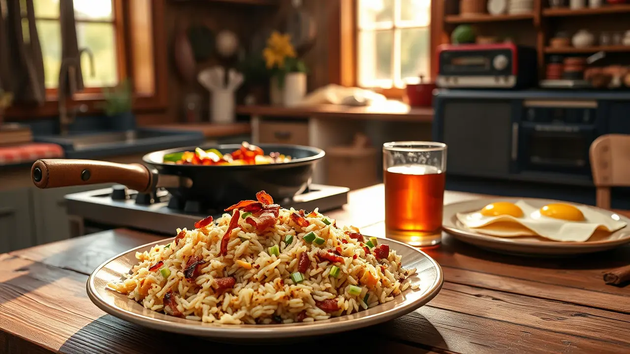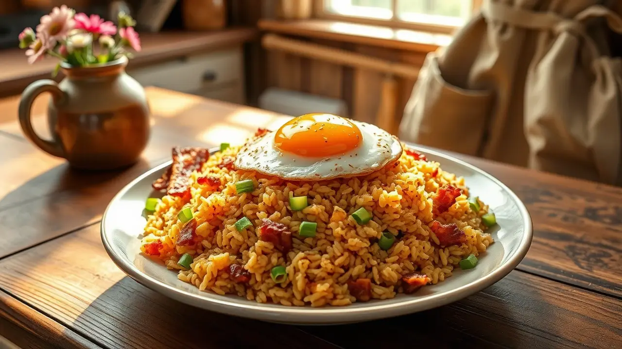# Southern Fried Rice 🍚🥓 This hearty and flavorful dish combines the comforting elements of fried rice with a Southern twist! It's an easy one-pan meal that’s perfect for any weeknight dinner or as a side for gatherings. Each spoonful is packed with the smoky goodness of bacon, sautéed veggies, and perfectly seasoned rice. Serve it alongside your favorite protein for a complete meal, or enjoy it as a delicious standalone comfort food. 🌟 ## Ingredients - 4 slices of bacon - 1 tbsp chopped green peppers - 1 tbsp chopped mushrooms - 1 tsp soy sauce - 1 medium onion, chopped - 2 cups cooked rice (day-old rice works best!) ## Instructions 1. In a heavy skillet, fry the bacon until crispy. Once done, remove the bacon and let it drain on paper towels, leaving the bacon grease in the skillet. > 🍳 Save those bacon drippings! They add incredible flavor to the dish. 2. In the same skillet, add the chopped onion, green peppers, and mushrooms. Sauté until they are soft and slightly browned, about 5-7 minutes. 3. Stir in the cooked rice, mixing it well with the veggies to ensure everything is evenly distributed. 4. Crumble the crispy bacon into the skillet and add the soy sauce. Stir everything together until well combined and heated through. > 🔥 If you prefer a little crunch, let the rice sit in the skillet for an additional minute or two before serving—this allows it to crisp up at the bottom. ## Variations - **Vegetarian**: Omit the bacon and use olive oil to sauté the vegetables. Add a splash of smoked paprika for a smoky flavor without the meat. 🌱 - **Spicy**: For some heat, add a pinch of red pepper flakes or diced jalapeños to the veggie mixture. - **Protein-Packed**: Add cooked shrimp or diced chicken for an extra layer of flavor and to transform it into a heartier dish. - **Herb-Infused**: Toss in some chopped green onions or fresh herbs like cilantro just before serving for a refreshing pop! ## Pro Tips - **Day-Old Rice**: Using rice that has been cooked in advance (preferably chilled) helps prevent the fried rice from becoming mushy. Freshly cooked rice tends to be too moist, making it difficult to achieve that perfect texture. - **Serving Suggestions**: This Southern Fried Rice pairs well with fried eggs on top! Just fry an egg sunny-side up and place it on your serving of fried rice for a breakfast twist that is oh-so-delicious. 🍳 Enjoy your culinary adventure with this simple yet satisfying Southern Fried Rice!name