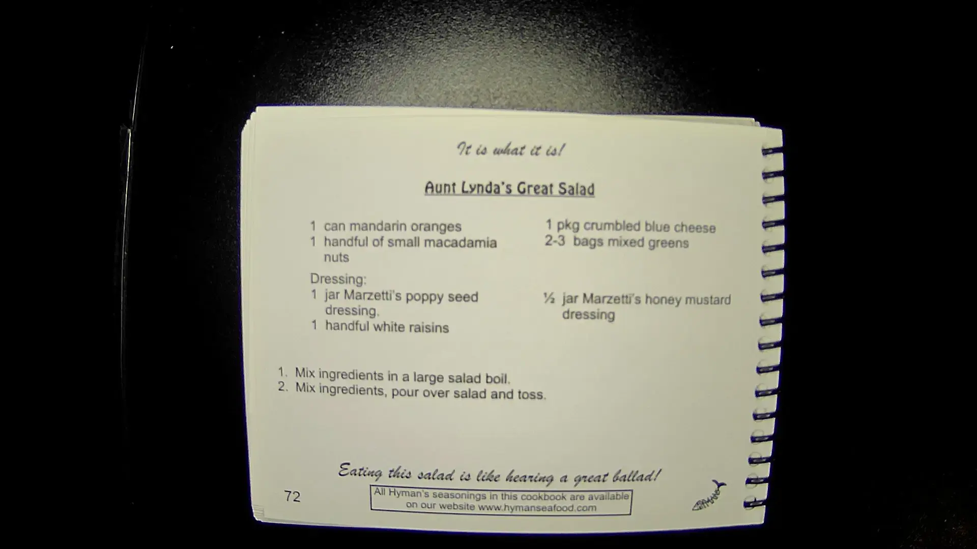 Here's the text from the image: --- **Aunt Lyndaβs Great Salad** - 1 can mandarin oranges - 1 handful of small macadamia nuts - 1 pkg crumbled blue cheese - 2-3 bags mixed greens **Dressing:** - 1 jar Marzetti's poppy seed dressing - 1 handful white raisins - Β½ jar Marzetti's honey mustard dressing **Instructions:** 1. Mix ingredients in a large salad bowl. 2. Mix ingredients, pour over salad and toss. --- *Eating this salad is like hearing a great ballad!* **72**llm