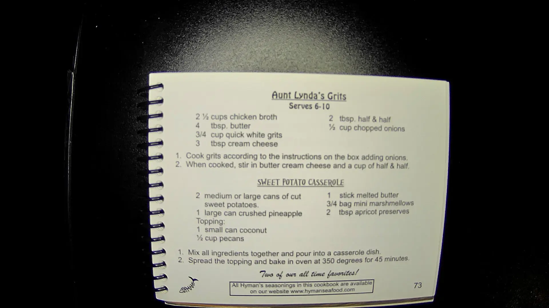 Here’s the text from the image: **Aunt Lynda's Grits** Serves 6-10 - 2 ½ cups chicken broth - 4 tbsp. butter - ¾ cup quick white grits - 3 tbsp cream cheese - 2 tbsp half & half - ½ cup chopped onions 1. Cook grits according to the instructions on the box adding onions. 2. When cooked, stir in butter, cream cheese, and a cup of half & half. --- **SWEET POTATO CASSEROLE** - 2 medium or large cans of cut sweet potatoes - 1 large can crushed pineapple - Topping - 1 small can coconut - ½ cup pecans - 1 stick melted butter - ¾ bag mini marshmallows - 2 tbsp apricot preserves 1. Mix all ingredients together and pour into a casserole dish. 2. Spread the topping and bake in the oven at 350 degrees for 45 minutes. **Two of our all-time favorites!** [Page 73]llm