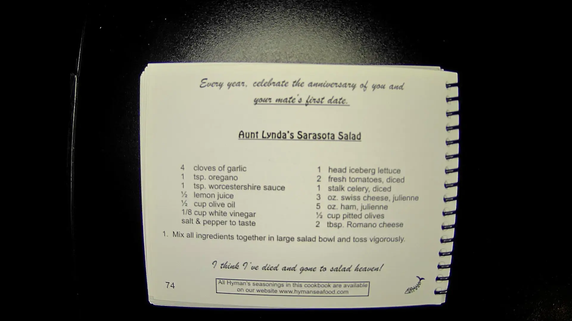 Here's the text from the image: --- **Every year, celebrate the anniversary of you and your mate's first date.** **Aunt Lynda's Sarasota Salad** - 4 cloves of garlic - 1 tsp. oregano - 1 tsp. Worcestershire sauce - ½ lemon juice - ⅓ cup olive oil - ⅛ cup white vinegar - salt & pepper to taste - 1 head iceberg lettuce - 2 fresh tomatoes, diced - 1 stalk celery, diced - 3 oz. Swiss cheese, julienne - 5 oz. ham, julienne - ½ cup pitted olives - 2 tbsp. Romano cheese **1. Mix all ingredients together in a large salad bowl and toss vigorously.** --- *I think I've died and gone to salad heaven!*llm