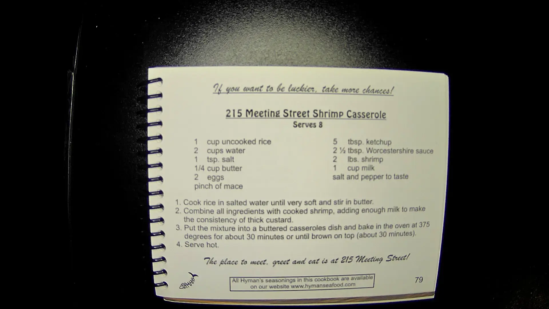 Here's the text from the image: --- **If you want to be luckier, take more chances!** **215 Meeting Street Shrimp Casserole** **Serves 8** - 1 cup uncooked rice - 2 cups water - 1 tsp. salt - 1/4 cup butter - 2 eggs - pinch of mace - 5 tbsp. ketchup - 2 1/2 tbsp. Worcestershire sauce - 2 cups shrimp - 1 cup milk - salt and pepper to taste **Instructions:** 1. Cook rice in salted water until very soft and stir in butter. 2. Combine all ingredients with cooked shrimp, adding enough milk to make the consistency of thick custard. 3. Put the mixture into a buttered casseroles dish and bake in the oven at 375 degrees for about 30 minutes or until brown on top (about 30 minutes). 4. Serve hot. **The place to meet, greet and eat is at 215 Meeting Street!** --- Let me know if you need anything else!llm