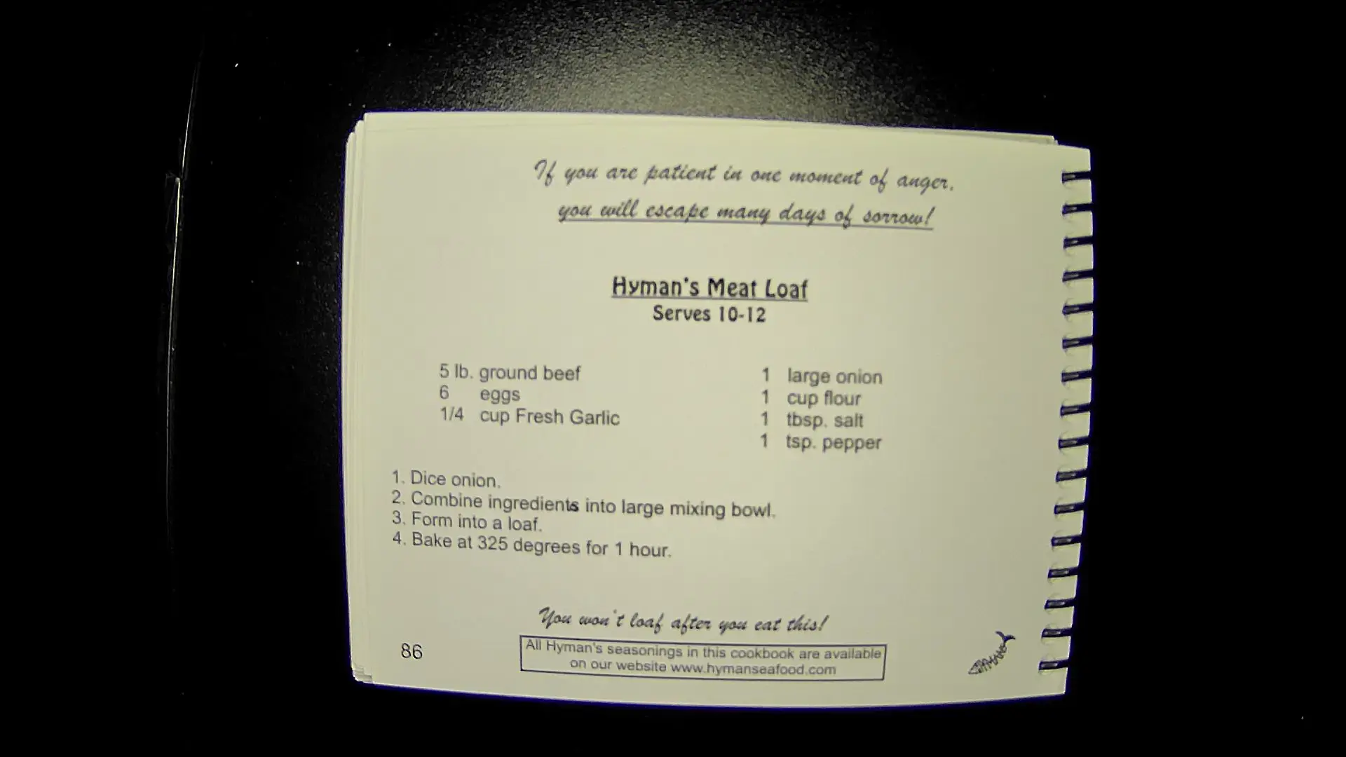 Here’s the text from the image: --- **If you are patient in one moment of danger, you will escape many days of sorrow!** **Hyman’s Meat Loaf** Serves 10-12 - 5 lb. ground beef - 6 eggs - 1/4 cup fresh garlic - 1 large onion - 1 cup flour - 1 tbsp. salt - 1 tsp. pepper 1. Dice onion. 2. Combine ingredients into large mixing bowl. 3. Form into a loaf. 4. Bake at 325 degrees for 1 hour. **You won’t loaf after you eat this!** All Hyman’s seasonings in this cookbook are available on our website www.hymanmeatloaf.com ---llm