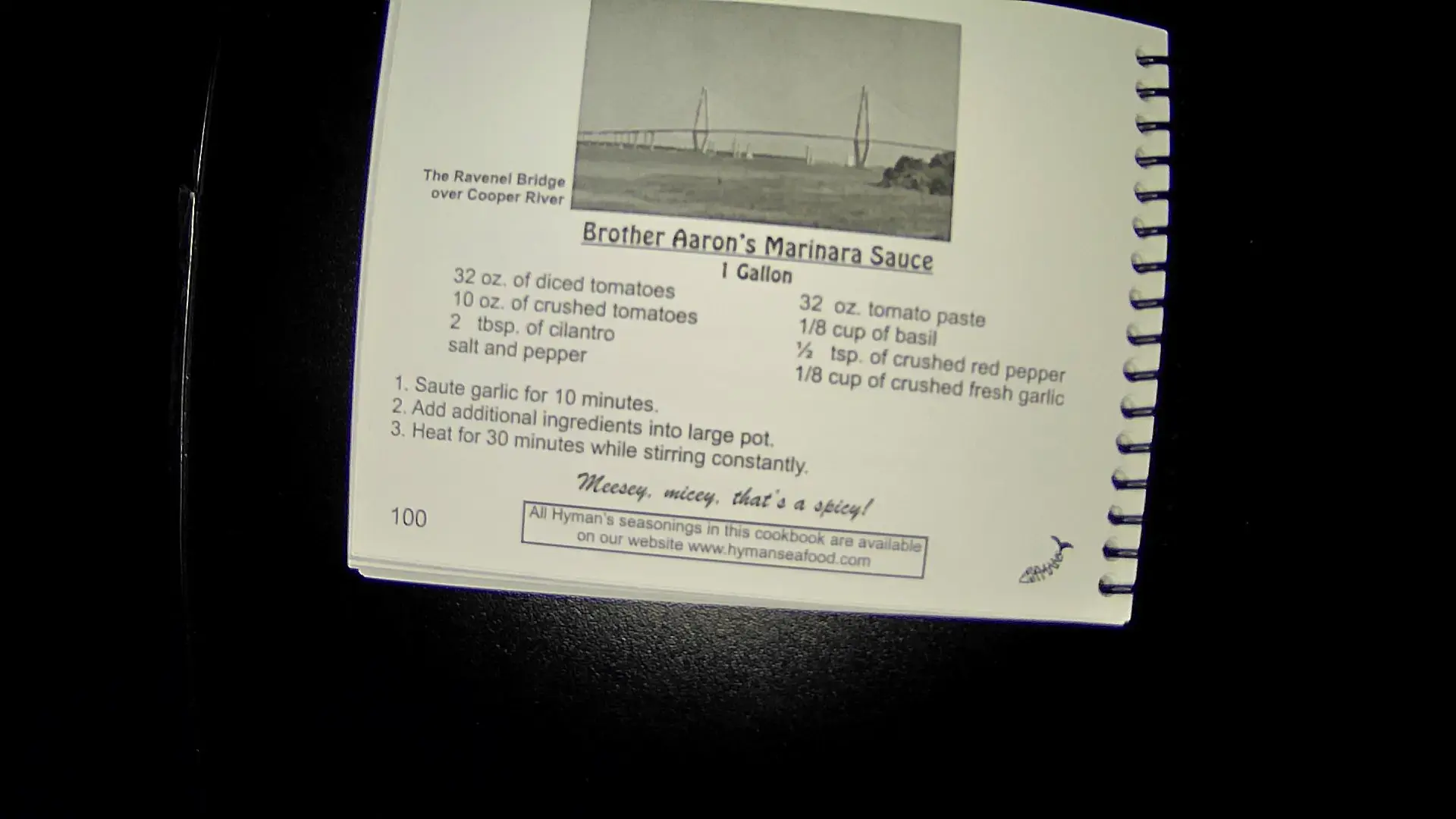 Here's the text from the image: --- **The Ravenel Bridge over Cooper River** **Brother Aaron's Marinara Sauce** **1 Gallon** - 32 oz. of diced tomatoes - 10 oz. of crushed tomatoes - 32 oz. tomato paste - 2 tbsp. of cilantro - 1/8 cup of basil - salt and pepper - ½ tsp. of crushed red pepper - 1/8 cup of crushed fresh garlic **Instructions:** 1. Sauté garlic for 10 minutes. 2. Add additional ingredients into large pot. 3. Heat for 30 minutes while stirring constantly. **Message, mercy, that's a spicy!** --- **Ab Hyman's seasonings in this cookbook are available on our website www.hymansseafood.com** ---llm