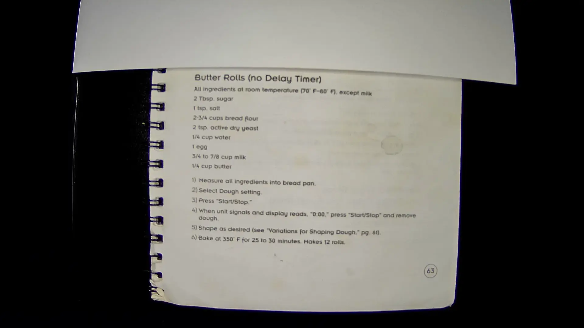 Sure! Here's the text from the image: **Butter Rolls (no Delay Timer)** All ingredients at room temperature (70°F - 80°F), except milk. - 2 Tbsp. sugar - 1 Tbsp. salt - 2 3/4 cups bread flour - 2 tsp. active dry yeast - 1/2 cup water - 1 egg - 3/4 to 1/2 cup milk - 1/4 cup butter 1. Measure all ingredients into bread pan. 2. Select Dough setting. 3. Press "Start/Stop." 4. When unit signals and display reads "0:00," press "Start/Stop" and remove dough. 5. Shape as desired (see "Variations for Shaping Dough," pg. 41). 6. Bake at 350°F for 25 to 30 minutes. Makes 12 rolls. (63)llm