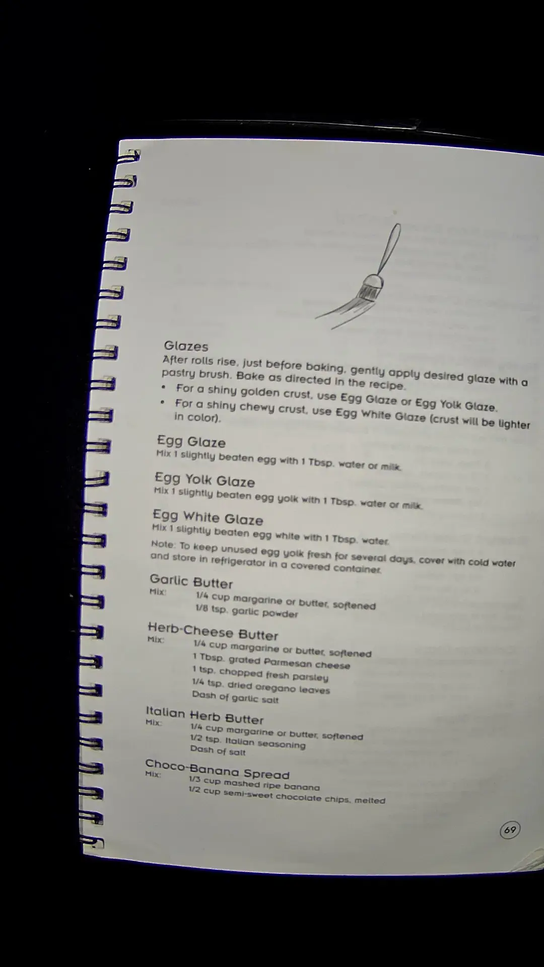 Sure! Here's the text from the image: --- **Glazes** After rolls rise, just before baking, gently apply desired glaze with a pastry brush. Bake as directed in the recipe. - For a shiny golden crust, use Egg Glaze or Egg Yolk Glaze. - For a shiny chewy crust, use Egg White Glaze (crust will be lighter in color). **Egg Glaze** Mix 1 slightly beaten egg with 1 Tbsp. water or milk. **Egg Yolk Glaze** Mix 1 slightly beaten egg yolk with 1 Tbsp. water or milk. **Egg White Glaze** Mix 1 slightly beaten egg white with 1 Tbsp. water. **Garlic Butter** Mix - ¼ cup margarine or butter, softened - ½ tsp garlic powder **Herb-Cheese Butter** Mix - ¼ cup margarine or butter, softened - 1 Tbsp. grated Parmesan cheese - 1 tsp. minced fresh parsley - ¼ tsp. dried oregano leaves - Dash of garlic salt **Italian Herb Butter** Mix - ¼ cup margarine or butter, softened - ½ tsp Italian seasoning - Dash of salt **Choco-Banana Spread** Mix - 1/3 cup mashed ripe banana - ½ cup semi-sweet chocolate chips, melted --- Let me know if you need anything else!llm
