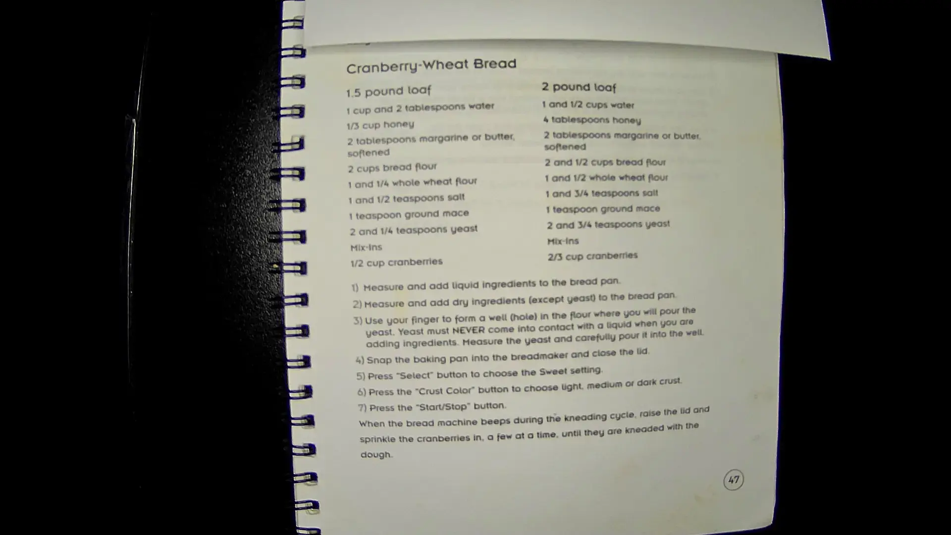 Here’s the text from the image: **Cranberry-Wheat Bread** **1.5 pound loaf:** - 1 cup and 2 tablespoons water - ⅓ cup honey - 2 tablespoons margarine or butter, softened - 3 cups bread flour - 1 and ½ whole wheat flour - 1 and ½ teaspoons salt - 1 teaspoon ground mace - 2 and ½ teaspoons yeast - ½ cup cranberries **2 pound loaf:** - 1 and ½ cups water - 4 tablespoons honey - 2 tablespoons margarine or butter, softened - 2 and ½ cups bread flour - 1 and ¾ cups whole wheat flour - 1 and ¾ teaspoons salt - 1 tablespoon ground mace - 2 and ¾ teaspoons yeast - 2/3 cup cranberries **Instructions:** 1. Measure and add liquid ingredients to the bread pan. 2. Measure and add dry ingredients (except yeast) to the bread pan. 3. Use your finger to form a well (hole) in the flour where you will pour the yeast. This must **NEVER** come into contact with liquid when you are adding ingredients. Measure the yeast and carefully pour it into the well. 4. Snap the baking pan into the breadmaker and close the lid. 5. Press “Select” button to choose the Sweet setting. 6. Press the “Crust Color” button to choose light, medium or dark crust. 7. Press the “Start/Stop” button. 8. When the bread machine beeps during the kneading cycle, raise the lid and sprinkle the cranberries in, a few at a time, until they are kneaded into the dough.llm
