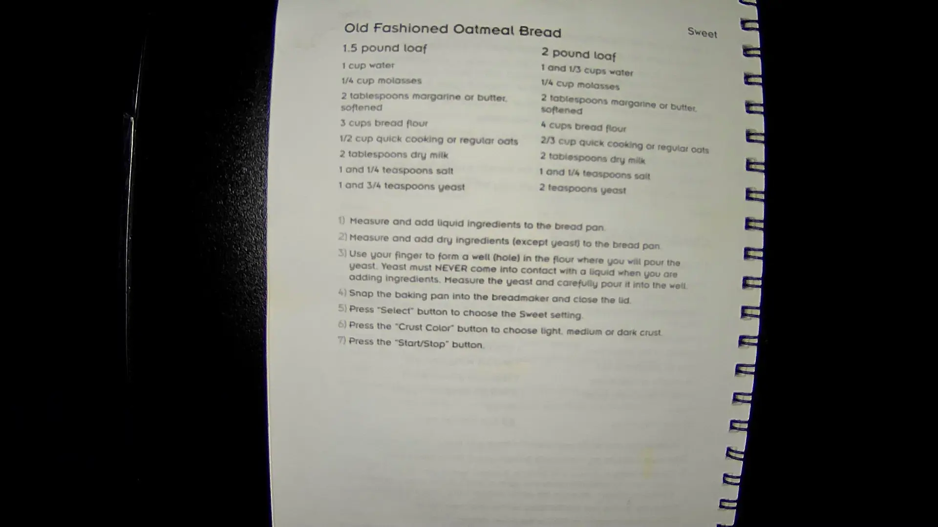 Here’s the text from the image: --- **Old Fashioned Oatmeal Bread** **1.5 pound loaf** - 1 cup water - ½ cup molasses - 2 tablespoons margarine or butter, softened - 2 cups bread flour - ½ cup quick or regular oats - 2 tablespoons sugar - 1 and 1/8 teaspoons salt - 1 and 3/4 teaspoons yeast **2 pound loaf** - 1 and 1/3 cups water - ¾ cup molasses - 2 tablespoons margarine or butter - 3 ½ cups bread flour - 1 cup quick or regular oats - 3 tablespoons sugar - 1 and ½ teaspoons salt - 2 teaspoons yeast **Instructions:** 1. Measure and add liquid ingredients to the bread pan. 2. Measure and add dry ingredients (except yeast) to the bread pan. 3. Use your finger to form a well (hole) in the flour where you will pour the yeast. Yeast must NEVER come into contact with liquid when adding ingredients. Measure the yeast and carefully pour it into the well. 4. Snap the baking pan into the breadmaker and close the lid. 5. Press the "Select" button to choose the Sweet setting. 6. Press the "Crust Color" button to choose light, medium or dark crust. 7. Press the "Start/Stop" button. --- Let me know if you need more help!llm