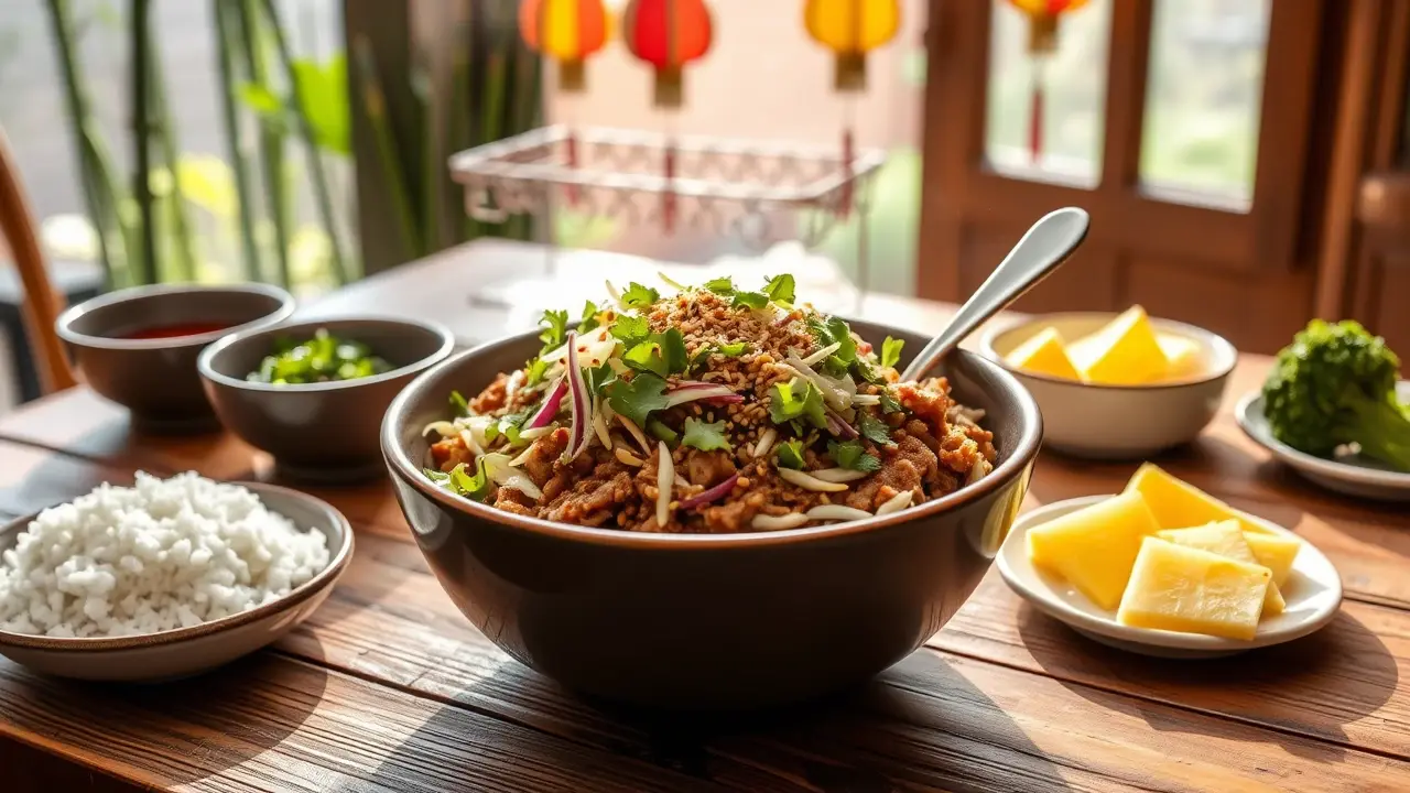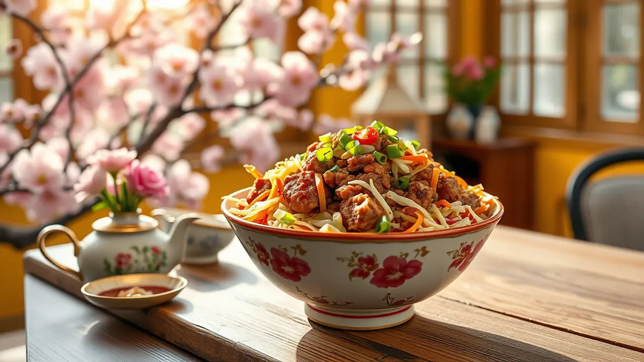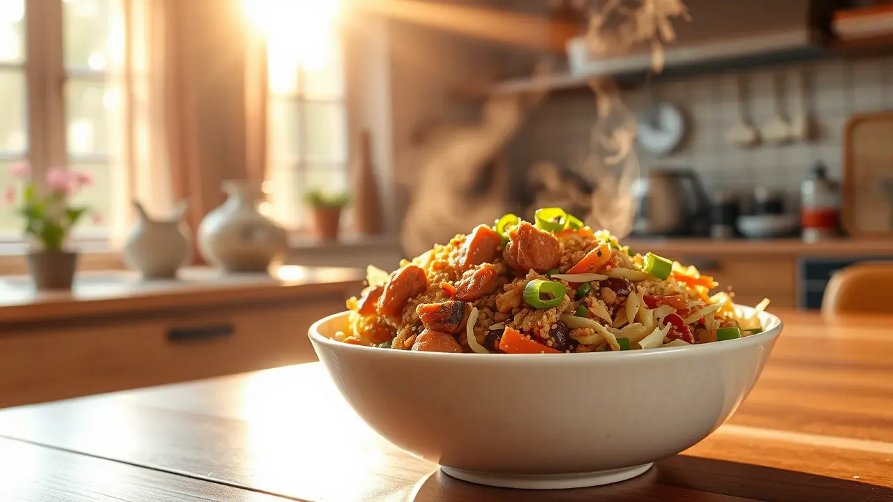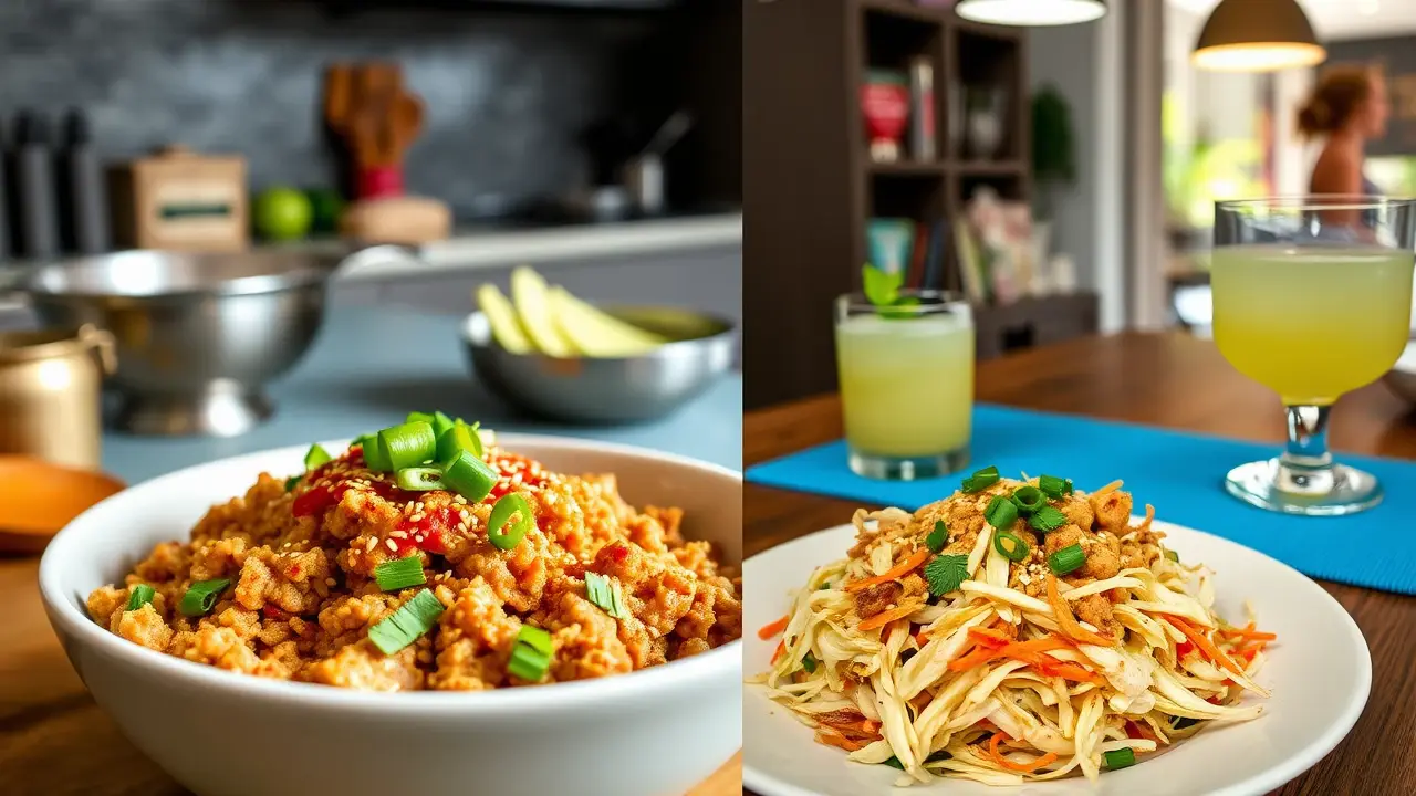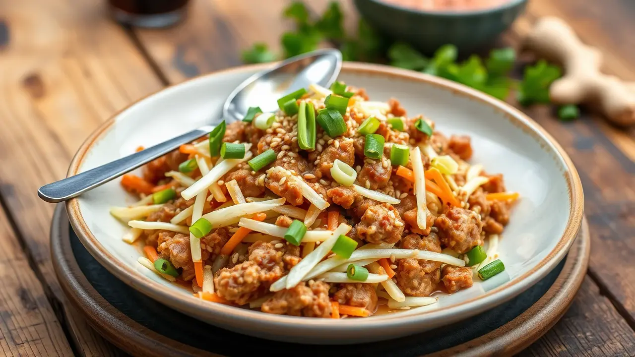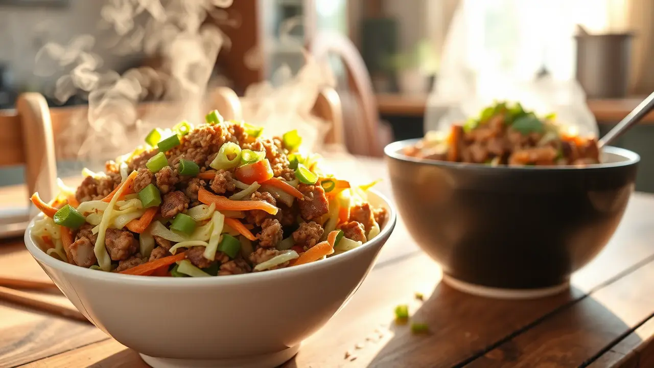 # Low Carb Egg Roll in a Bowl 🥢🥬 This Low Carb Egg Roll in a Bowl is a quick and flavorful weeknight dinner that's both healthy and satisfying. It captures all the delicious flavors of traditional egg rolls without the carbs, making it a guilt-free option. Packed with protein and veggies, this dish can be on your table in under 30 minutes! ## Ingredients ### For the stir-fry - 1 lb ground pork (or chicken/turkey) - 4 cups coleslaw mix (shredded cabbage and carrots) - 2 tablespoons soy sauce (or tamari for gluten-free) - 1 tablespoon sesame oil - 2 cloves garlic, minced - 1 teaspoon fresh ginger, grated or minced - 3 green onions, chopped - 1 tablespoon rice vinegar - Salt and pepper to taste ### For serving (optional) - Sriracha or hot sauce - Chopped cilantro - Sesame seeds ## Instructions 1. **Cook the meat**: In a large skillet over medium heat, add the ground pork (or chicken/turkey) and cook until browned and cooked through, breaking it up with a spatula as it cooks. Drain excess fat if needed. 2. **Add flavor**: Stir in the minced garlic and ginger, and cook for an additional minute until fragrant. 3. **Vegetable time**: Add the coleslaw mix to the skillet, followed by the soy sauce, sesame oil, rice vinegar, and chopped green onions. Toss everything together and cook until the cabbage is slightly wilted, about 3-5 minutes. 4. **Season**: Taste and season with salt, pepper, and additional soy sauce if desired. > 🥄 The mixture should be well combined and the cabbage just tender. Don't overcook, as you want some crunch remaining! 5. **Serve it up**: Spoon the egg roll mixture into bowls and top with your choice of Sriracha, chopped cilantro, and sesame seeds if desired. > 🌶️ Adjust the level of spice in this dish by adding more or less Sriracha based on your preference. ## Variations - **Vegetarian**: Swap out the meat for crumbled tofu or tempeh for a plant-based option. You may want to sauté the tofu first to get it crispy for added texture. 🌱 - **Spicy Kick**: Add diced jalapeños or a sprinkle of crushed red pepper flakes for an extra hit of heat! 🔥 - **Different Flavors**: Experiment with different proteins, like shrimp or beef, or add in some diced bell peppers or mushrooms for extra veggies. - **Saucy**: If you want a richer sauce, add a splash of hoisin sauce, or for a lower-carb option, try adding a tsp of peanut or almond butter for a nutty twist. Enjoy this quick and delicious meal that's sure to satisfy your cravings without the carbs! 🍽️🥢name