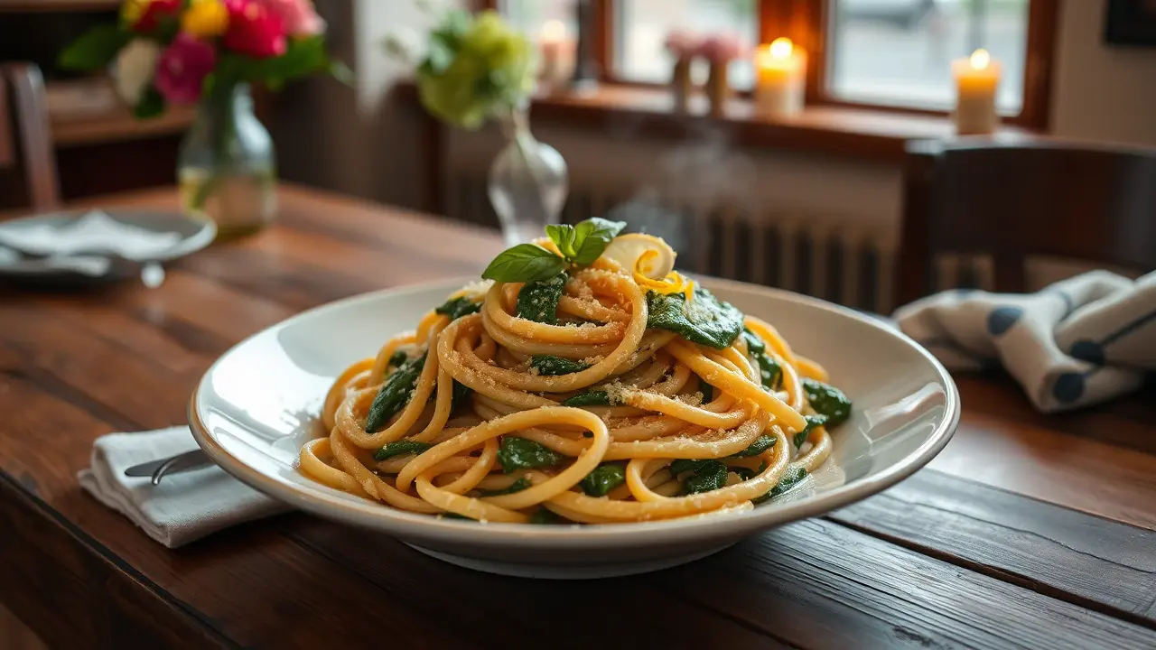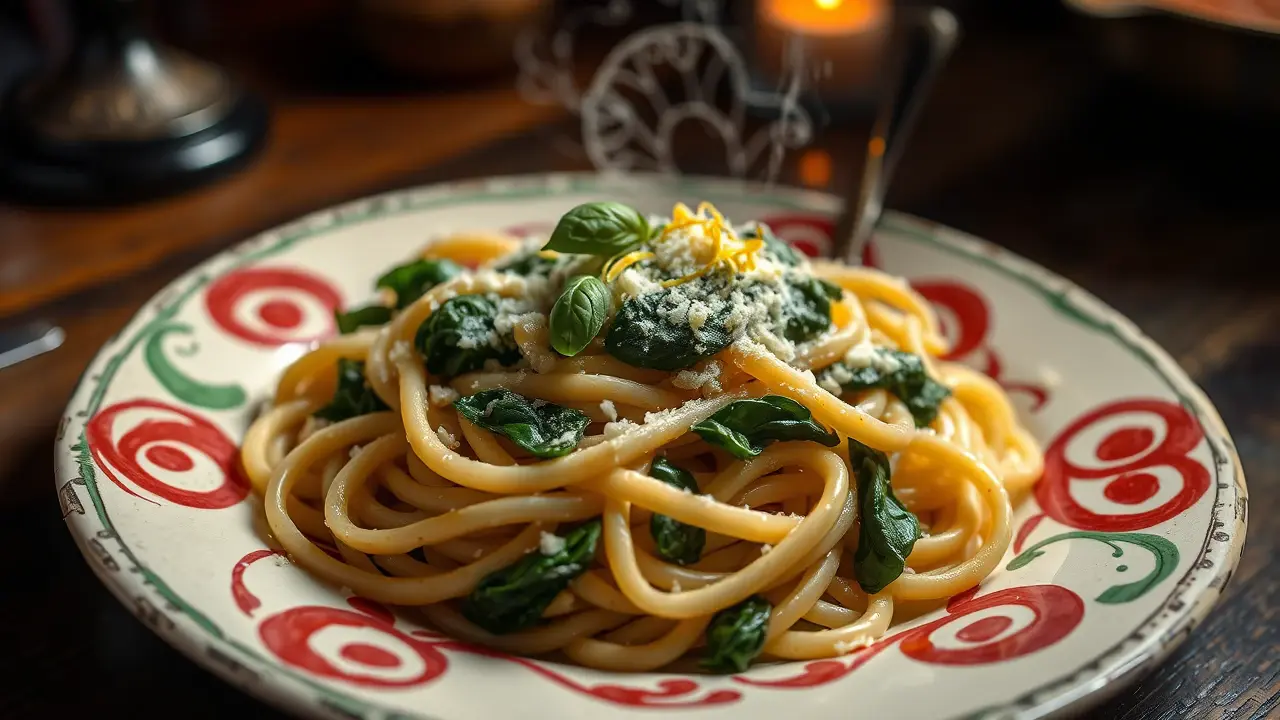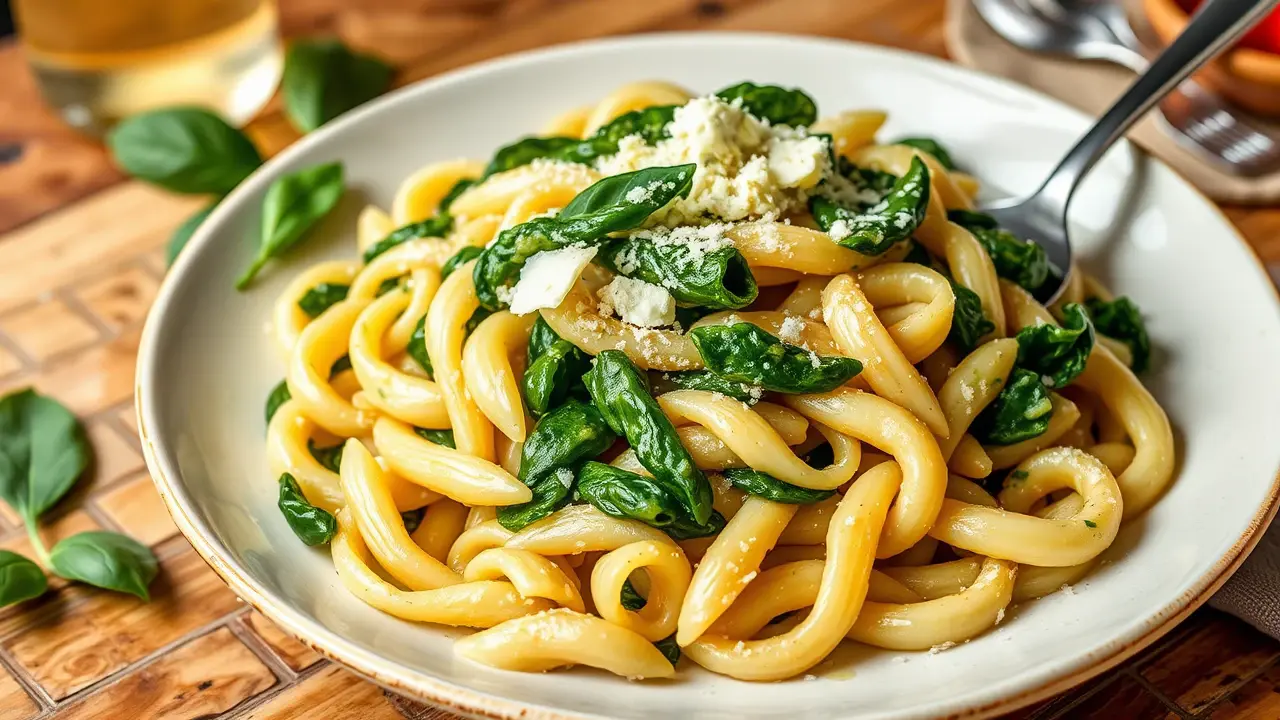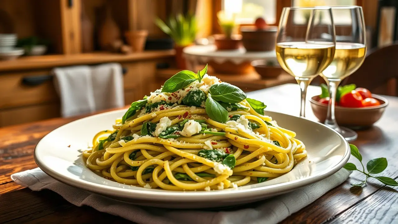 # Simple Spinach Ricotta Pasta 🍝🌱 This delightful pasta dish combines the creamy goodness of ricotta cheese with the fresh, vibrant taste of spinach. It's quick to prepare and uses minimal ingredients, making it perfect for a weeknight dinner or a comforting weekend meal. The creamy sauce clings to the pasta beautifully, while the spinach adds a burst of color and flavor. Serve it alongside a crisp salad and a glass of white wine for a complete meal! 🍷🥗 ## Ingredients ### For the pasta - 12 oz of pasta (any shape you prefer, such as penne or fusilli) - 2 cups of fresh spinach (washed and chopped) - 1 cup of ricotta cheese - 1/2 cup of grated Parmesan cheese - 2 tablespoons of olive oil - 2 cloves of garlic (minced) - Salt and pepper to taste - A pinch of red pepper flakes (optional) ### For garnish - Extra grated Parmesan - Fresh basil leaves (optional) - Zest of 1 lemon ## Instructions - **Cook the pasta**: In a large pot, cook the pasta according to package instructions in salted water until al dente. Reserve about a cup of pasta cooking water, then drain the pasta and set aside. > 🥣 Make sure to save some pasta water! This starchy water will help emulsify the sauce and create a creamy consistency. - **Sauté the garlic**: In the same pot or a large skillet, heat the olive oil over medium heat. Add the minced garlic and sauté for about 1 minute until fragrant, being careful not to burn it. - **Add the spinach**: Toss in the chopped spinach and cook until wilted, about 2-3 minutes. If using red pepper flakes, add them now for a little kick! - **Mix in the cheeses**: Reduce the heat to low, then add the ricotta and Parmesan cheese. Stir until the mixture is well combined and creamy. If it's too thick, gradually add some reserved pasta water until you reach your desired consistency. - **Combine with pasta**: Add the drained pasta to the skillet and toss everything together until the pasta is evenly coated with the sauce. Season with salt and pepper to taste. > 🌿 For an extra burst of flavor, consider adding the zest of a lemon just before serving—it brightens up the dish beautifully! - **Serve**: Plate the pasta and sprinkle with additional Parmesan cheese, fresh basil leaves, and a drizzle of olive oil if desired. ## Variations - **Add proteins**: Toss in cooked chicken, shrimp, or sautéed mushrooms for a heartier meal. 🍗🦐 - **Herb-infused**: Stir in other fresh herbs like thyme or parsley for added depth of flavor. - **Creamy vegan option**: Use a dairy-free ricotta alternative and toss in some nutritional yeast for a cheesy flavor. Consider adding some cashew cream for creaminess. 🌱 - **High altitude**: If you're cooking at high altitudes, you may need to increase your cooking time slightly for the pasta and adjust the amount of liquid in the sauce. Enjoy your Simple Spinach Ricotta Pasta—perfectly creamy, colorful, and oh-so-satisfying! 😋🍽️name