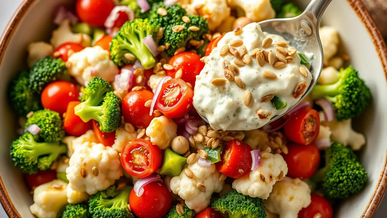 ๐ฅฆ To keep the broccoli and cauliflower extra crunchy, you can blanch them in boiling water for just 1-2 minutes and then plunge them into ice water before adding them to the salad. This method enhances the color and maintains their crispiness.