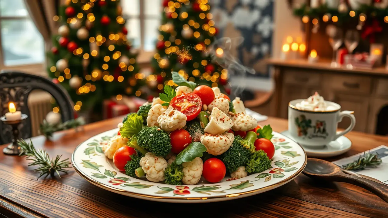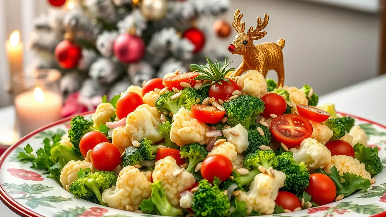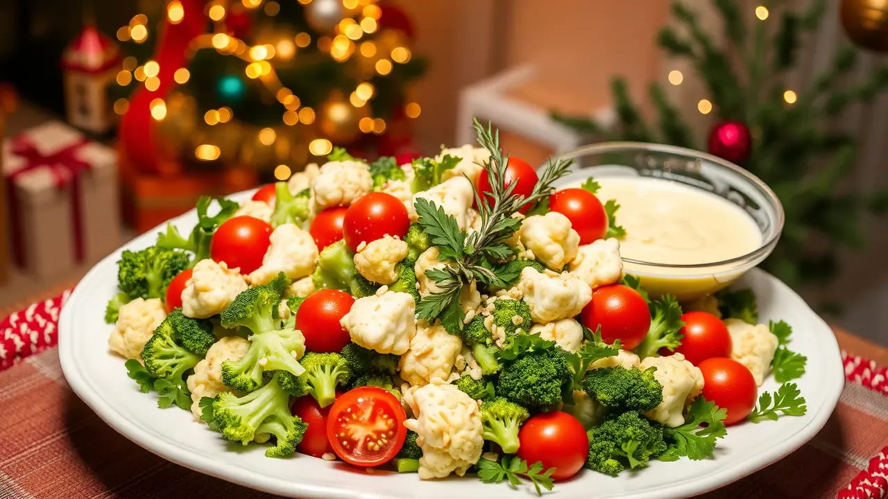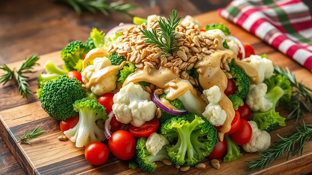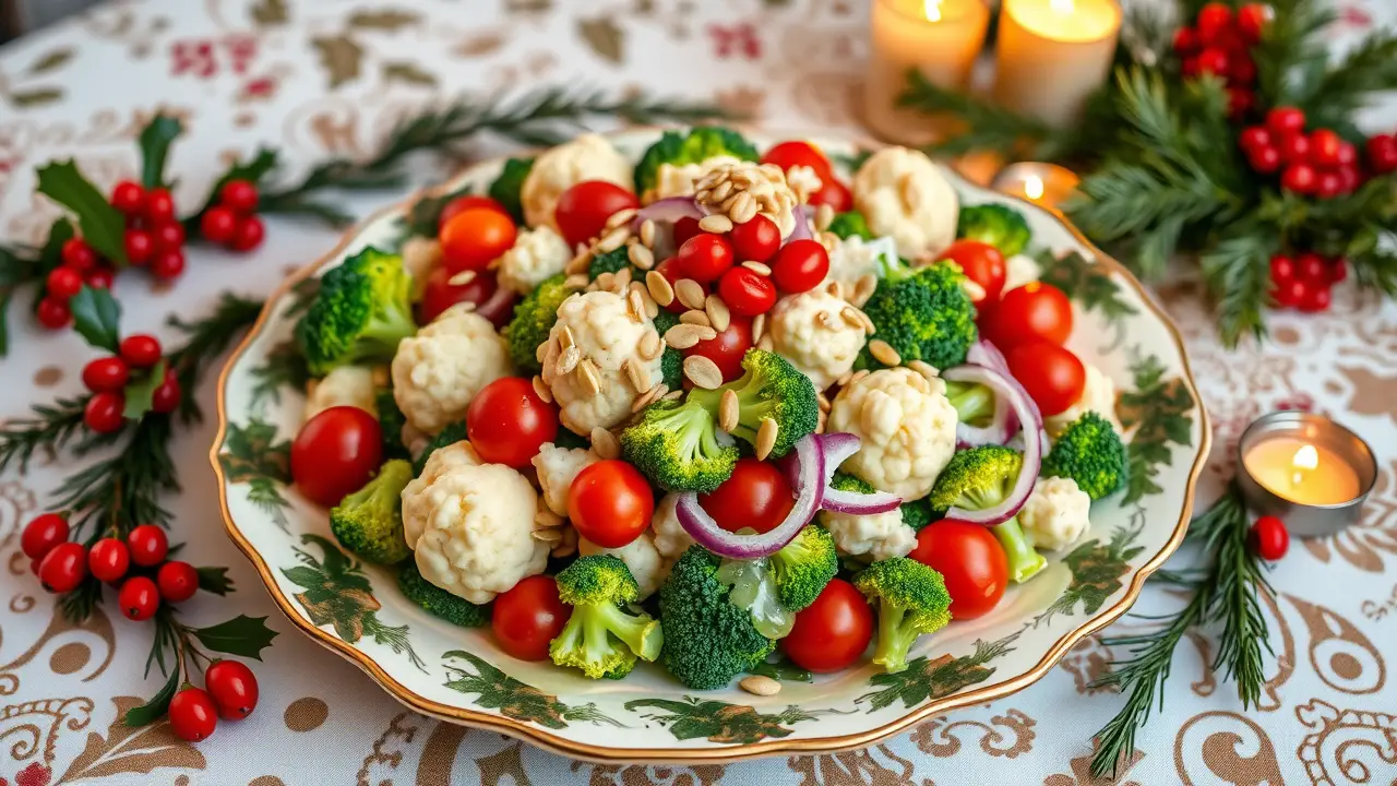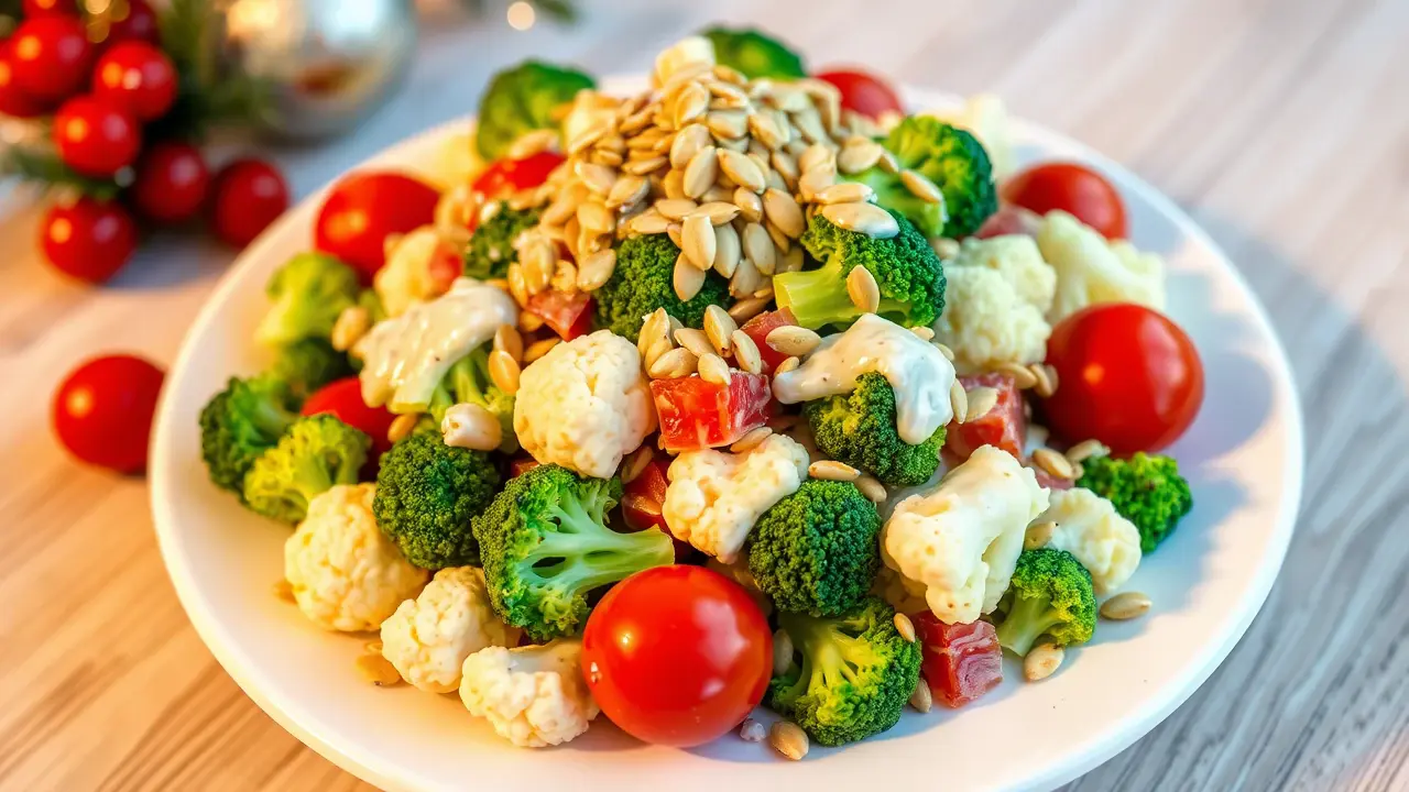 # Christmas Salad: Broccoli, Cauliflower & Tomatoes in Creamy Dressing ๐๐ฅ This vibrant and festive salad is a delightful addition to your holiday spread! Packed with crunchy veggies and a creamy dressing, it's not only delicious but also nutritious. The combination of broccoli, cauliflower, and tomatoes creates a beautiful medley that will brighten any Christmas table. Perfect for family gatherings or celebrations with friends, this salad is sure to be a crowd-pleaser! ## Ingredients ### For the salad - 2 cups of fresh broccoli florets - 2 cups of fresh cauliflower florets - 1 cup of cherry tomatoes, halved - 1/2 cup of red onion, finely chopped - 1/4 cup of sunflower seeds (or your favorite nuts for extra crunch) ### For the creamy dressing - 1/2 cup of mayonnaise - 1/4 cup of sour cream (or Greek yogurt for a healthier option) - 1 tablespoon of apple cider vinegar - 1 tablespoon of honey (or maple syrup for a vegan option) - 1 teaspoon of garlic powder - Salt and pepper to taste ## Instructions - In a large mixing bowl, add the broccoli florets, cauliflower florets, cherry tomatoes, and red onion. Toss them together until evenly mixed. > ๐ฅฆ To keep the broccoli and cauliflower extra crunchy, you can blanch them in boiling water for just 1-2 minutes and then plunge them into ice water before adding them to the salad. This method enhances the color and maintains their crispiness. - In a separate bowl, whisk together the mayonnaise, sour cream, apple cider vinegar, honey, garlic powder, salt, and pepper until smooth. > ๐ฏ Adjust the sweetness of the dressing to your preference by adding more honey or maple syrup if you like it sweeter. - Pour the creamy dressing over the salad and mix gently until the vegetables are well-coated. > ๐ For an even creamier texture, let the salad sit in the fridge for about 30 minutes before serving. This allows the flavors to meld beautifully! - Just before serving, sprinkle the sunflower seeds on top for added crunch. ## Variations - **Add protein**: Toss in some cooked and diced chicken or chickpeas for additional protein, making it a more substantial dish! ๐๐ฅซ - **Herby twist**: Add chopped fresh herbs like parsley, dill, or cilantro to the salad for a burst of fresh flavor. ๐ฟ - **Cheesy goodness**: Mix in some crumbled feta cheese or shredded cheddar for a delightful cheesy addition! ๐ง - **Spicy kick**: Incorporate diced jalapeรฑos or a dash of hot sauce into the dressing for a spicy twist! ๐ถ๏ธ This Christmas salad is not just a feast for the eyes; itโs also a delightful mix of sweet and savory that will leave your guests asking for seconds! ๐ Enjoy it at your holiday table and make it a part of your annual festive traditions!name